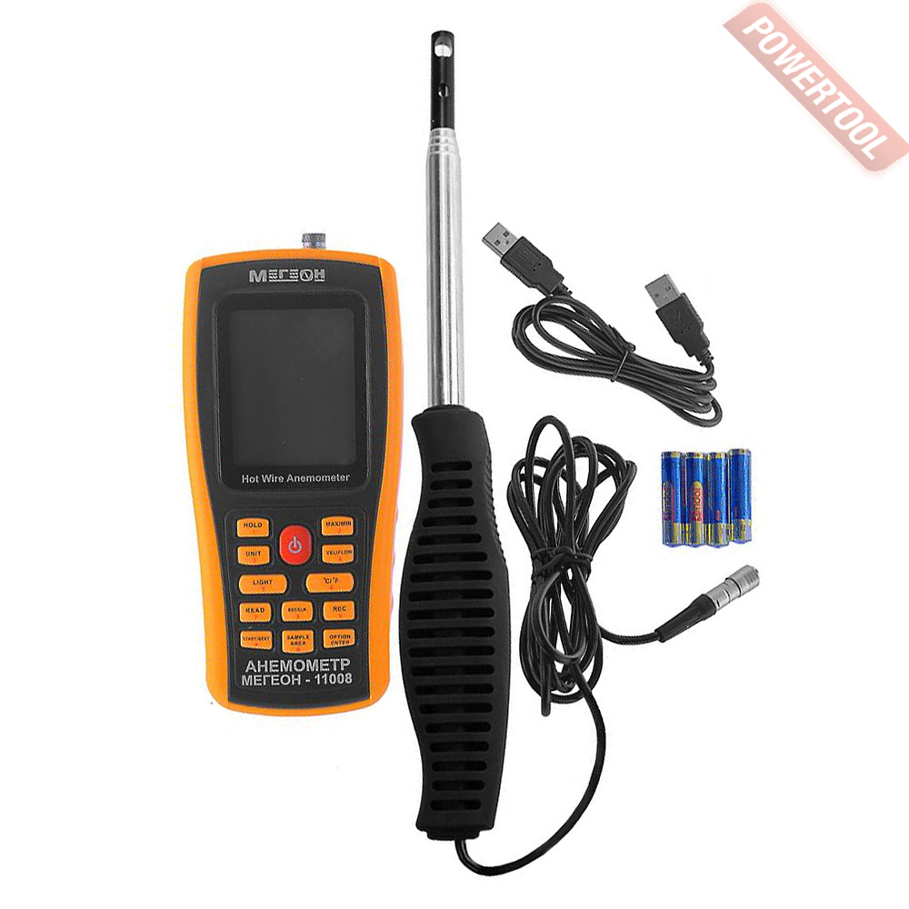 Термоанемометр с обогреваемой струной, диапазон измерений скорости 0-30 м/с, погрешность 3 процента плюс 0,1, разрешение 0,001 м/с, диапазон измерений температуры от 0 до 45 градусов С, диапазон измерения величины воздушного потока 0-999900 куб.м/мин, индикация минимальных, максимальных и средних значений, функция удержания данных HOLD, настройка конфигурации воздуховода, память 500 измерений, USB-интерфейс, ПО для обработки результатов, выбор единиц измерения СИ/USCS, питание от 4 батарей типа ААА, время непрерывной работы 20 часов, звуковое оповещение при нажатии на клавиши, резьба под штатив, вес 0,084 кг, защитный чехол.