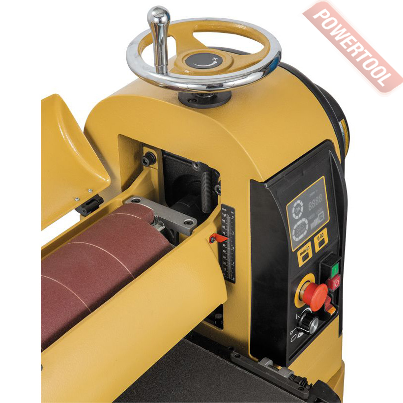 Для регулировки высоты положения шлифовального барабана предусмотрен массивный маховик с полированной поверхностью. Положение можно контролировать по привычной шкале на корпусе, но можно и по цифровому индикатору, так нагляднее и точнее. Он имеет переключатель режима отображения (дюймы/ миллиметры) и кнопку сброса для установки нулевого положения, что удобно как при смене толщины заготовок, так и при переходе к другой зернистости абразива. В качестве последнего используется лента шлифовальной бумаги, намотанная на алюминиевый барабан. Ее концы фиксируются в специальных зажимах, обеспечивающих простоту фиксации и автоматическое натяжение.