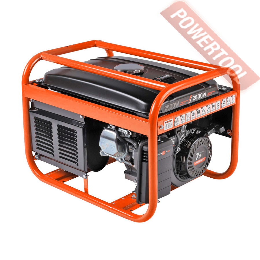 Бензиновый генератор однофазный 220 В, максимальная мощность 2,8 кВт, номинальный ток 10,9 А, 4-тактный бензиновый двигатель Patriot 212cc объемом 212 куб.см и мощностью 7 л.с., топливный бак 15 л, расход топлива 1,9 л/ч, емкость картера 0,6 л, 2 розетки 220В/16A, выход на 12В, время работы без дозаправки топлива 7,8 ч, автоматическая регулировка напряжения AVR, цифровой дисплей, счетчик моточасов, защита от перегрузки, датчик низкого уровня масла, открытый кожух, размеры 610х445х440 мм, вес 38,8 кг, свечной ключ, провода для зарядки АКБ.