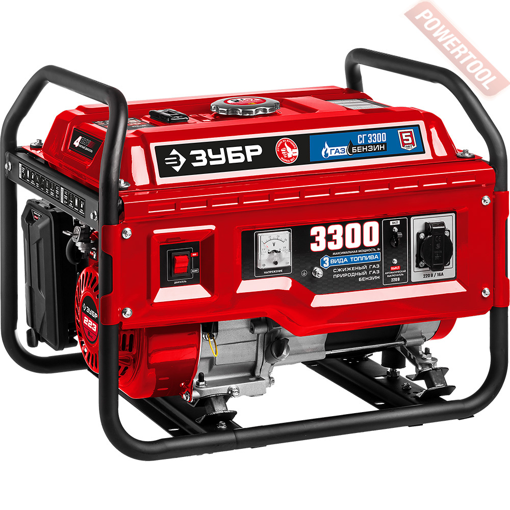 Бензиновый генератор с возможностью работы на газе, однофазный 220 В, мощность 4,2 кВт, 4-тактный бензиновый двигатель KOHLER CH395 мощностью 7,1 л.с., топливный бак 7,3 л, ёмкость картера 1,1 л, ручной запуск, открытый корпус, 2 розетки 220В/16А, защита от перегрузки, автоматический контроль масла, вес 67,5 кг.