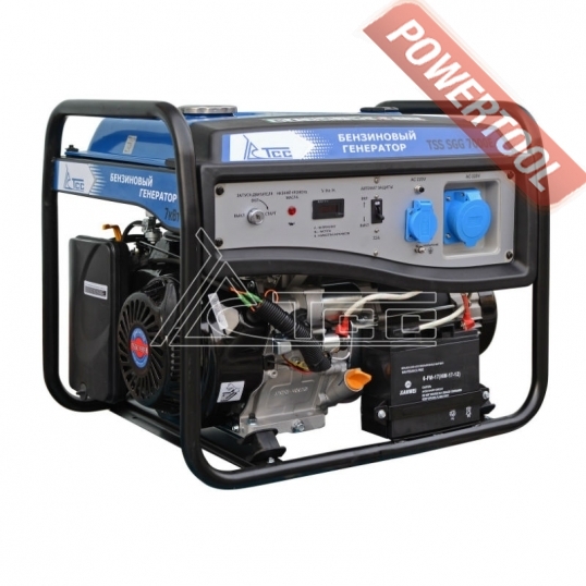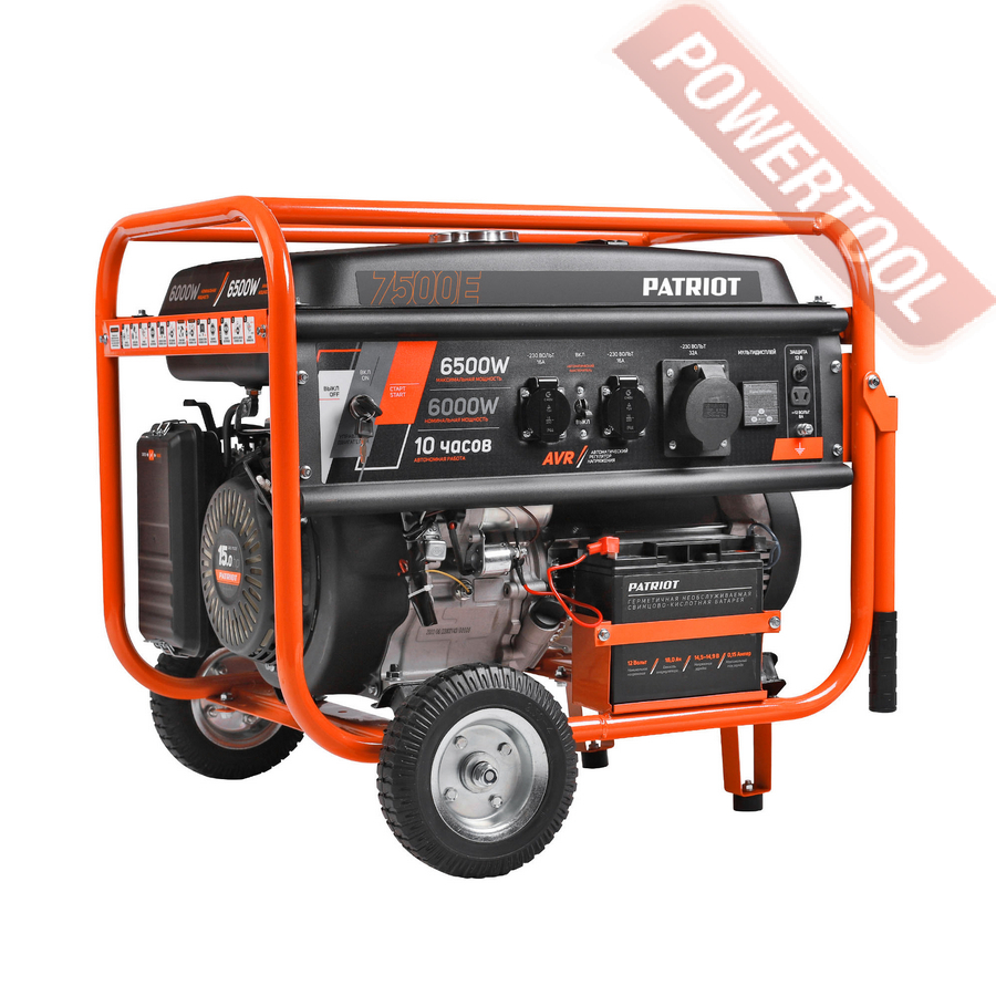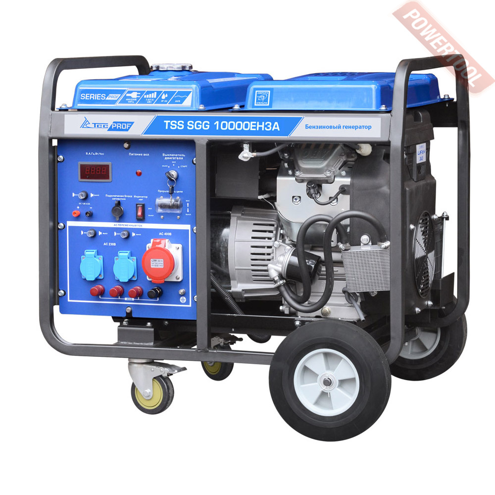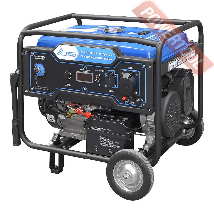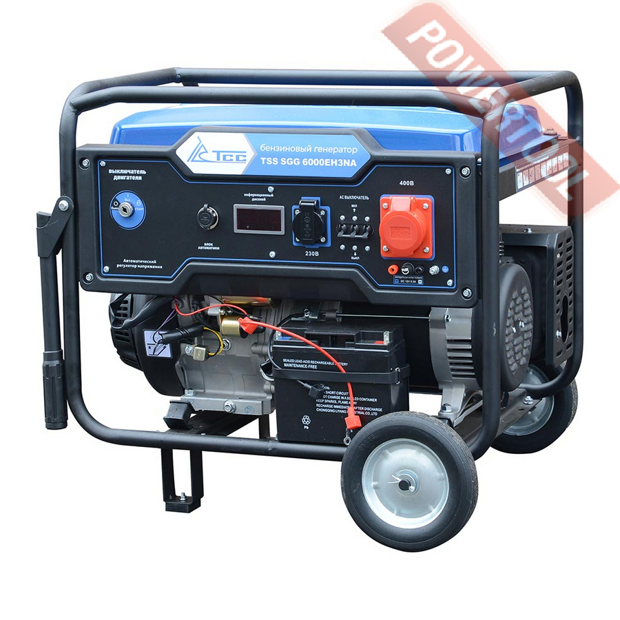 Бензиновый генератор трехфазный 380/220 В, мощность 6 кВт, номинальный ток 25 А, 4-тактный бензиновый двигатель объемом 389 куб.см и мощностью 13 л.с. с электростартером, топливный бак 25 л, расход топлива 3,55 л/ч, объем картера 1,1 л, 3 розетки 220В/16А и 1 розетка 380В/16А, выход 12 В, AVR, вольтметр, защита от перегрузки, индикатор уровня топлива, датчик уровня масла, размеры 795х585х580 мм, вес 100 кг, набор для перемещения, аккумулятор.