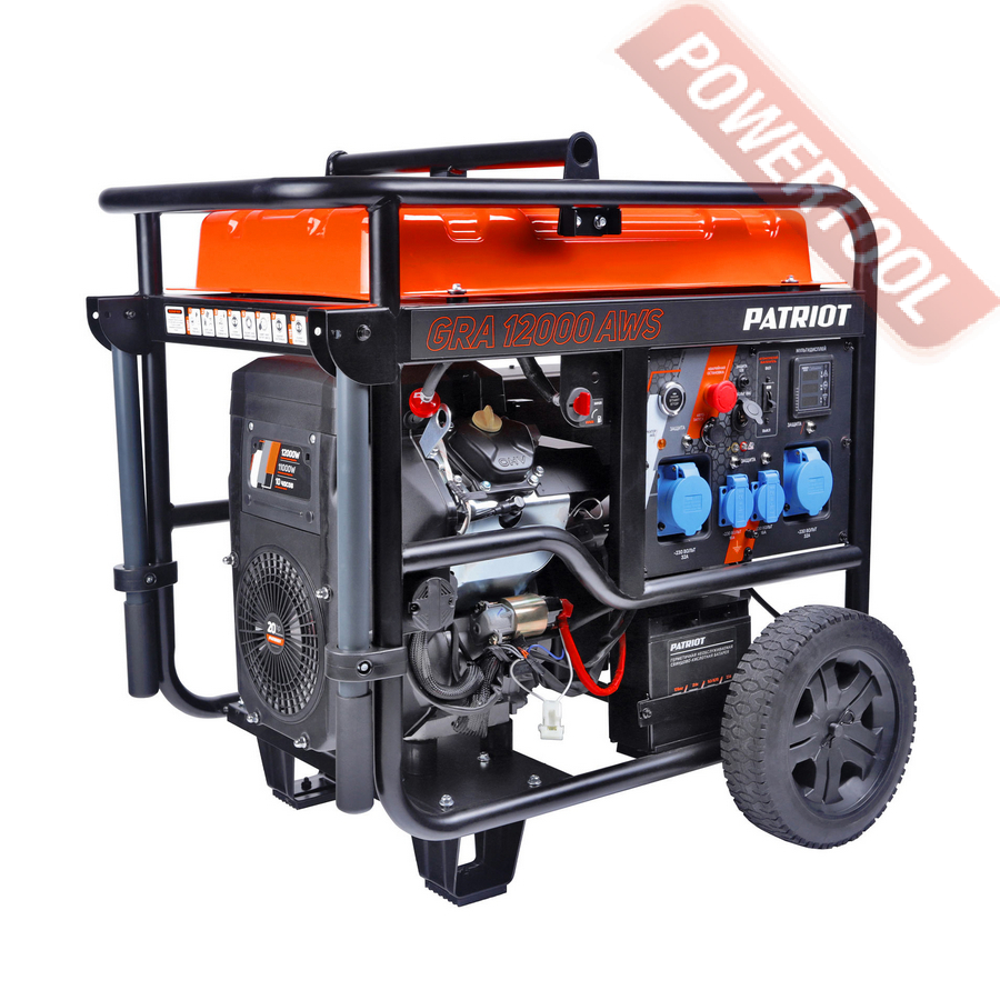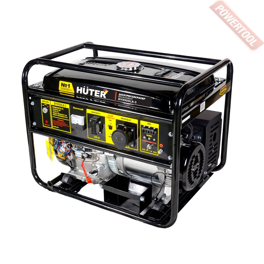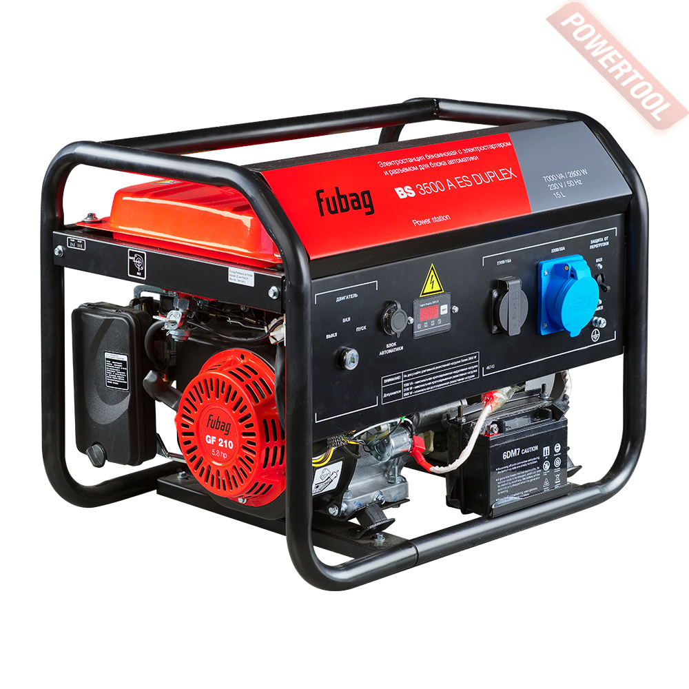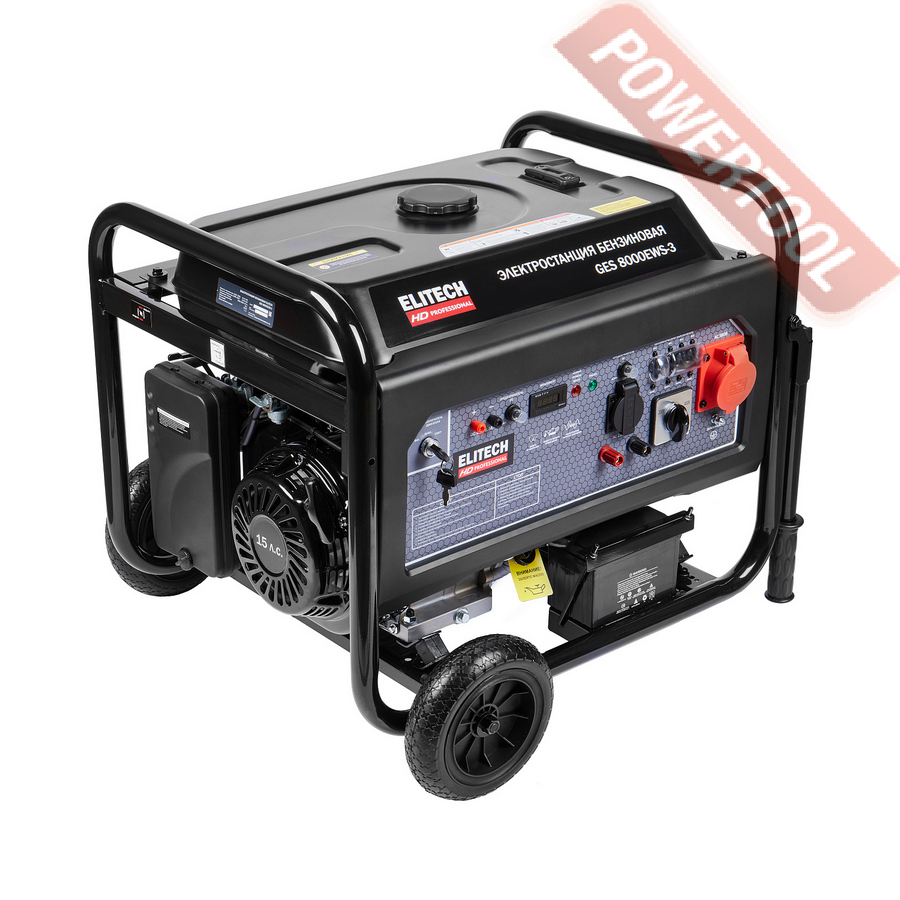 Бензиновый генератор трехфазный 380/220 В, мощность 6 кВт, номинальный ток 25 А, 4-тактный бензиновый двигатель объемом 389 куб.см и мощностью 13 л.с. с электростартером, топливный бак 25 л, расход топлива 3,55 л/ч, объем картера 1,1 л, 3 розетки 220В/16А и 1 розетка 380В/16А, выход 12 В, AVR, вольтметр, защита от перегрузки, индикатор уровня топлива, датчик уровня масла, размеры 795х585х580 мм, вес 100 кг, набор для перемещения, аккумулятор.