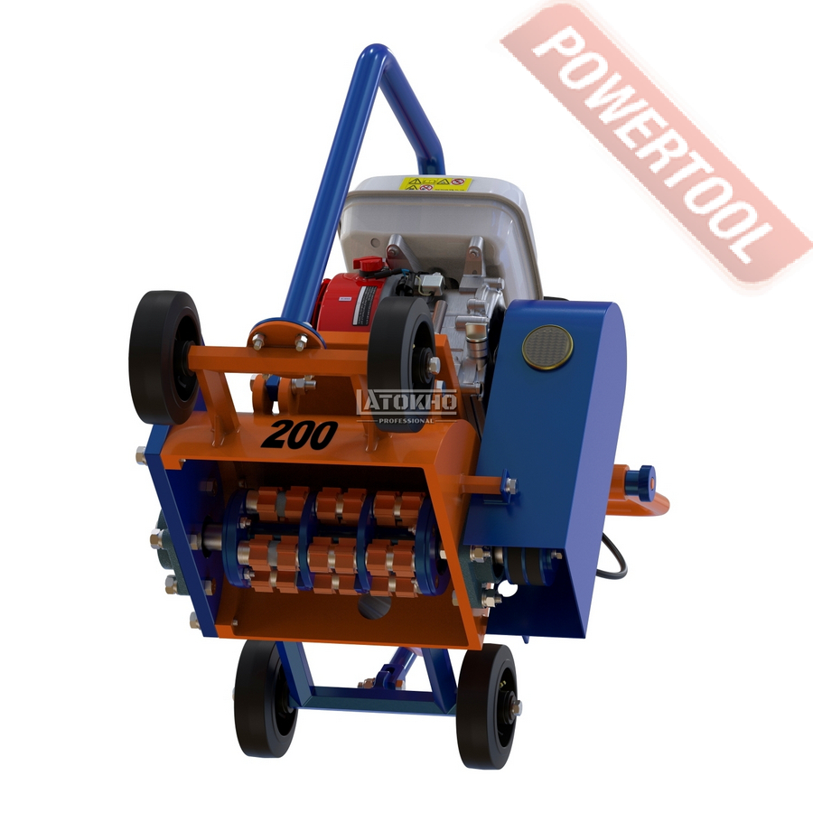 Демаркировочная бензиновая машина, глубина обработки 0-5 мм, рабочая ширина 200 мм, производительность до 60 кв.м/ч, тип режущей гарнитуры фреза, 4-тактный бензиновый двигатель Loncin G200F объемом 196 куб.см и мощностью 5,45 л.с., топливный бак 3,6 л, емкость картера 0,6 л, размеры 1310x515x1000 мм, вес 113 кг, барабан (фреза) с пятигранными ножами Latokho DSC 200 в комплекте.