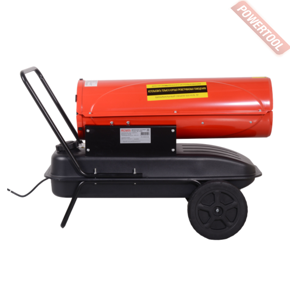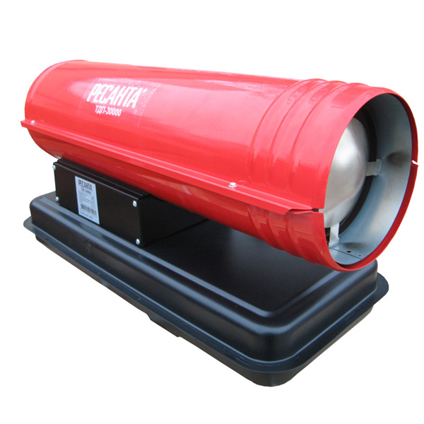 Дизельная тепловая пушка прямого нагрева РЕСАНТА ТДП-30000 может применяться на открытых или хорошо проветриваемых объектах, например, на строительных площадках, заводах, в складских помещениях. Предназначена для высокопроизводительного обогрева нежилых помещений, прогрева бетона или грунта при строительных и ремонтных работах. За короткое время может, обеспечить теплом большое пространство. Открытая камера сгорания выбрасывает вредные продукты вместе с горячим воздухом, поэтому применять в закрытых помещениях с людьми её нельзя. Перемещение и ввод в эксплуатацию не требует особых усилий и знаний. Запуск осуществляется нажатием одной кнопки, после продува системы происходит поджиг и дизельное топливо начинает равномерно сгорать в камере, а вентилятор создает воздушный поток и выдувает теплые массы в окружающее пространство. Уже на первой минуте работы жидкотопливного нагревателя, ощущается высокий КПД системы. Установка этой машины должна происходить в помещениях с возможностью проветривания, давая тем самым выход продуктам сгорания. Так как в технологии изготовления применен процесс прямого нагрева, то вместе с прогретым воздухом из сопла выходят элементы горения. Если нагнетательное давление сбалансировано и форсунка настроена правильно, то выхлопов минимальное количество, копать и темный дым отсутствуют.