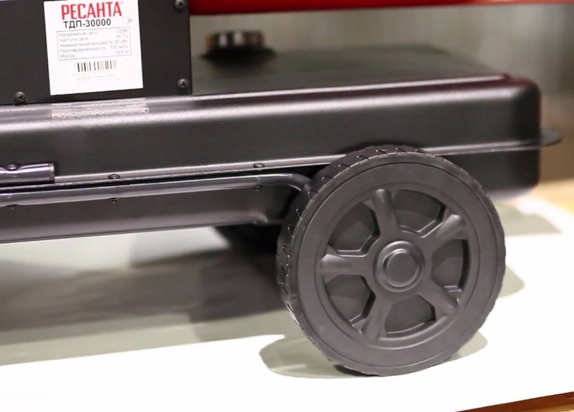 - Транспортировка. По своим характеристикам имеет компактные габариты и вес, что делает ее эргономичной и удобной для перевозки. Колеса и удобная рукоятка позволяют с легкостью перемещать тепловую пушку по объекту.
