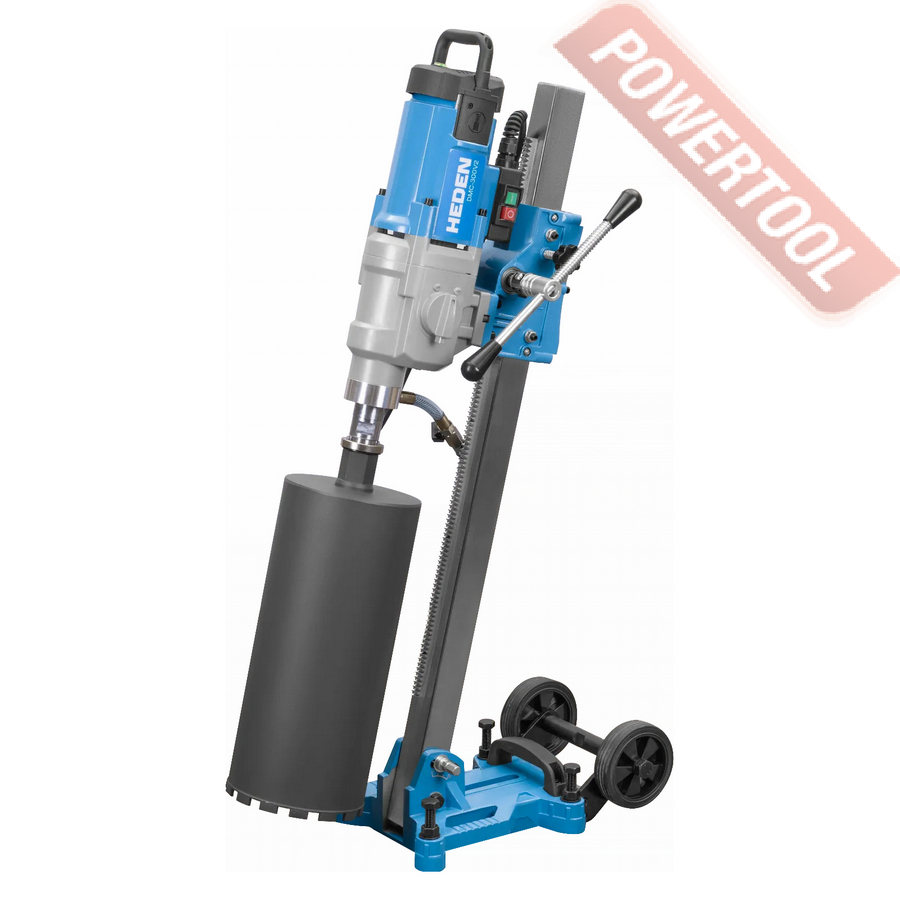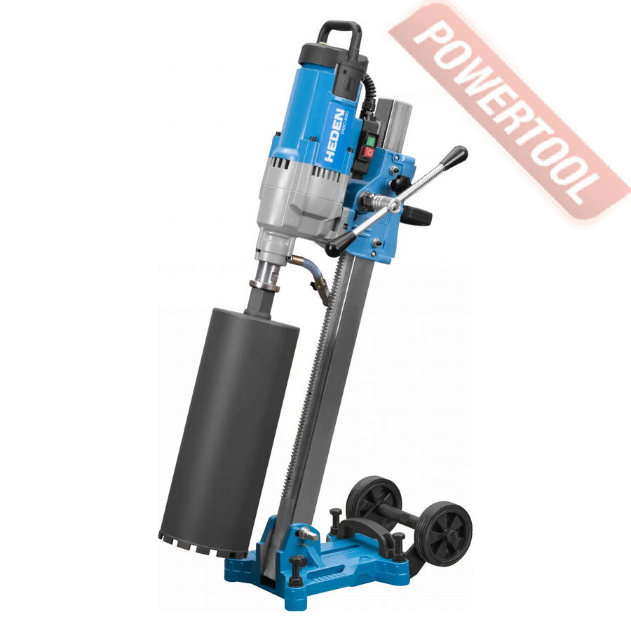 Дрель алмазного бурения, 1705 Вт, электрический двигатель 220 В, 2 скорости, 1100/2350 об/мин, диаметр сверления до 152 мм, резьба шпинделя 1/2 дюйма, защита от перегрузки, плавный пуск, вес 5,4 кг.