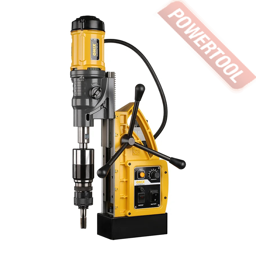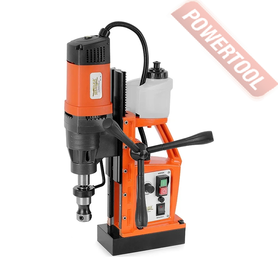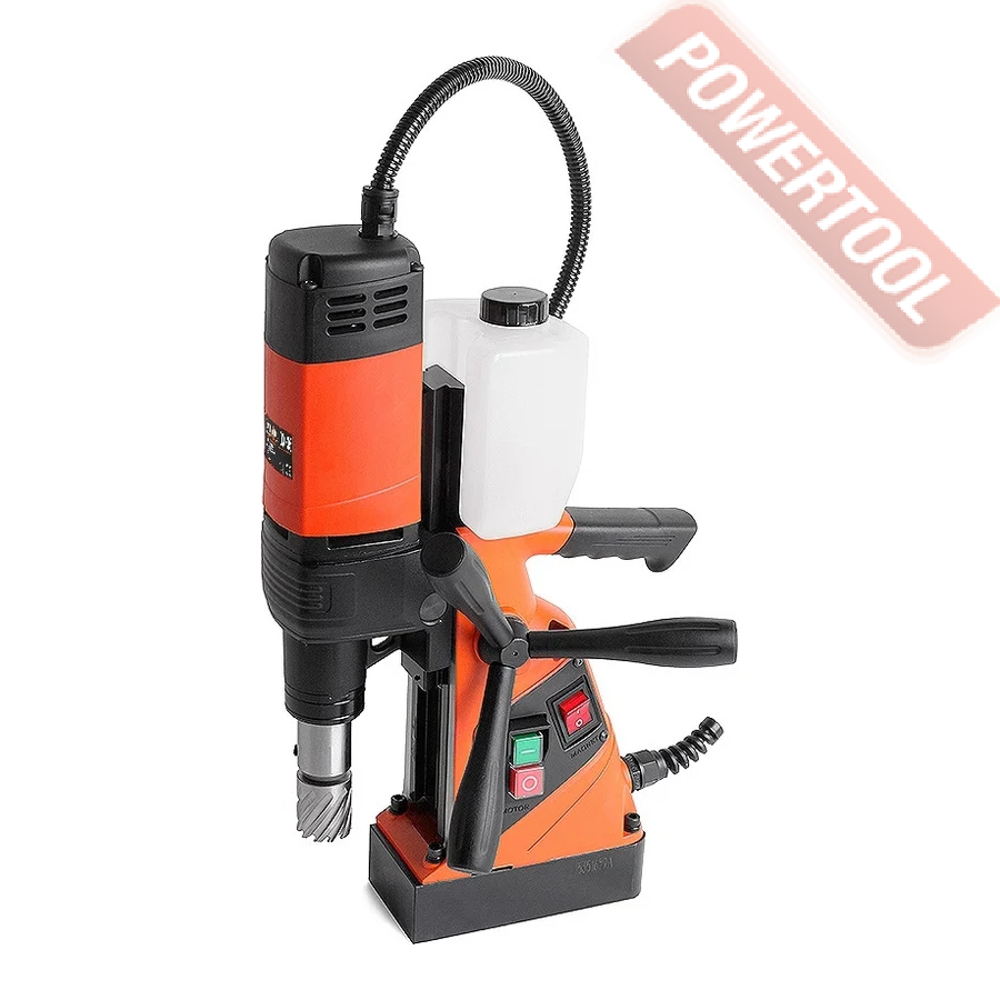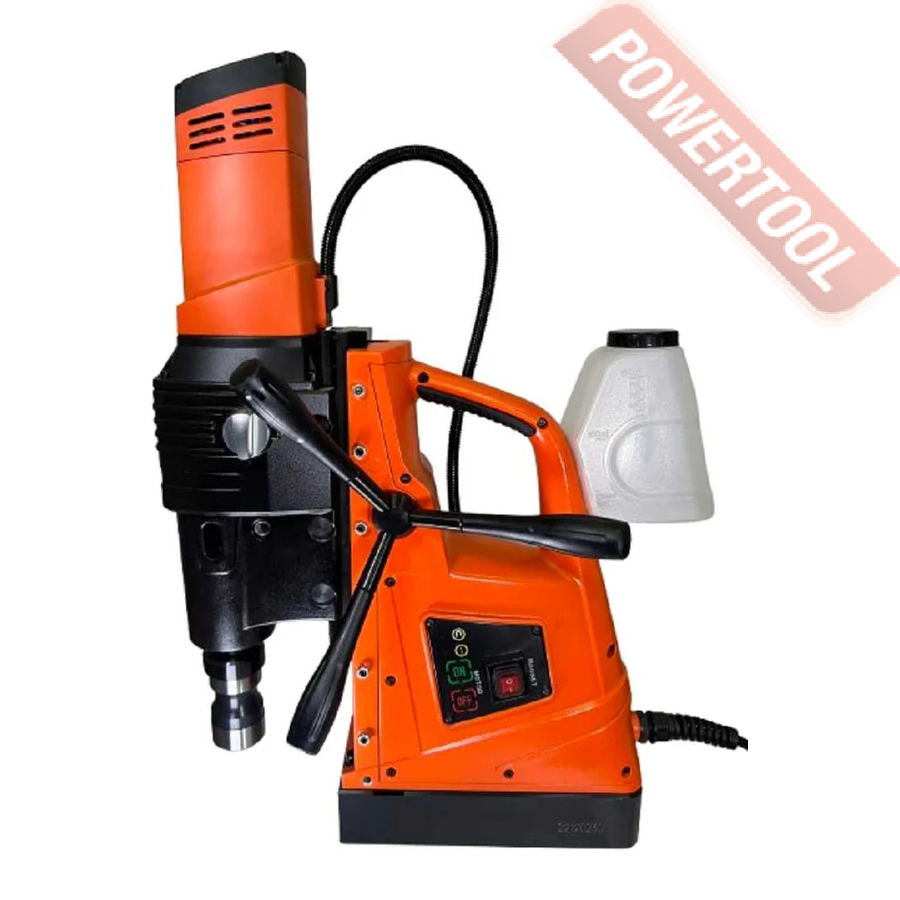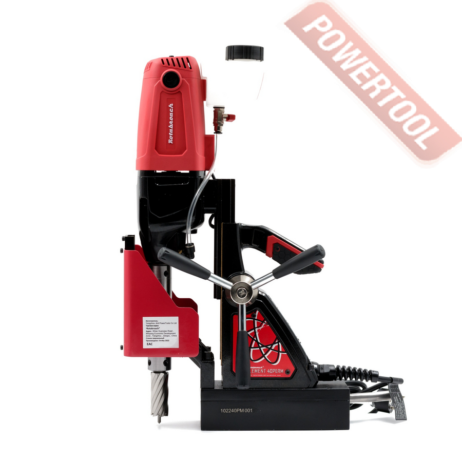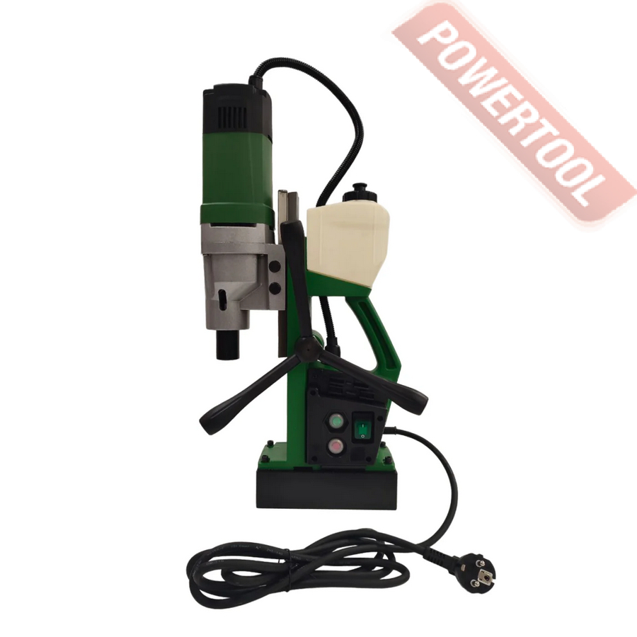 Магнитный сверлильный станок, 1200 Вт, 220 В, max диаметр корончатого сверла 42 мм, max диаметр спирального сверла 16 мм, крепление корончатого сверла на Weldon 19, частота вращения шпинделя 180-330 об/мин, 3 скорости, прижимная сила 10000 Н, вес 11,5 кг, регулировка оборотов, система подачи СОЖ, в комплекте система охлаждения, страховочный ремень, рукоятка подачи 3 шт, набор щестигранников, кейс.