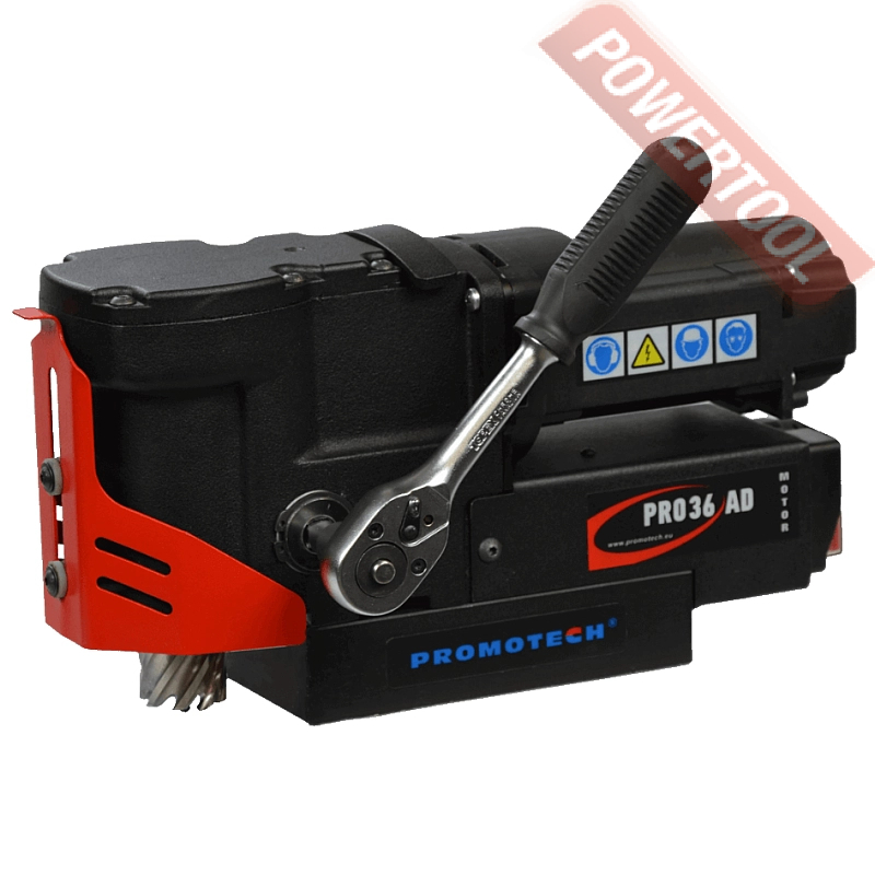 • Мощность 1200 Вт двигателя, передаваемая через трехступенчатый редуктор, позволяет сверлить с помощью коронок отверстия диаметром до 42 мм в стальных изделиях толщиной до 50 мм.