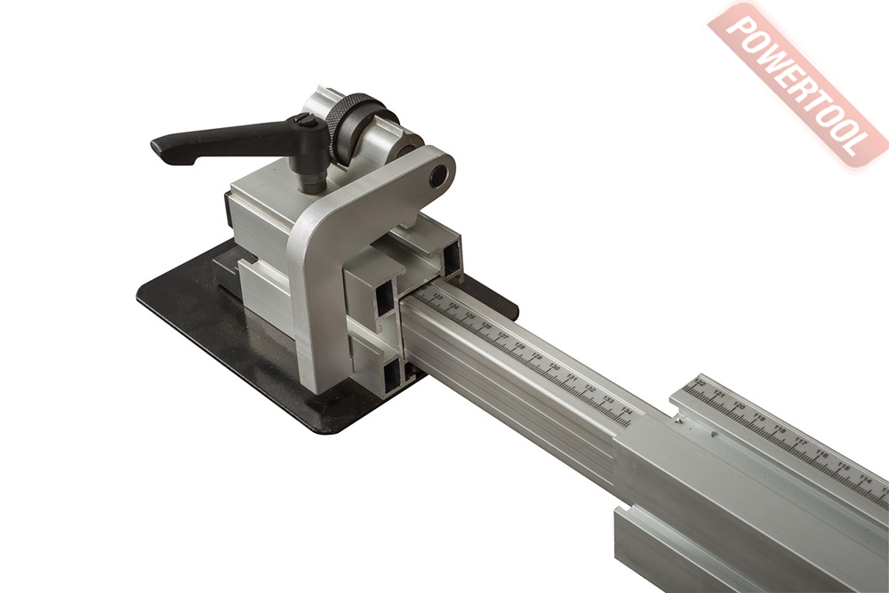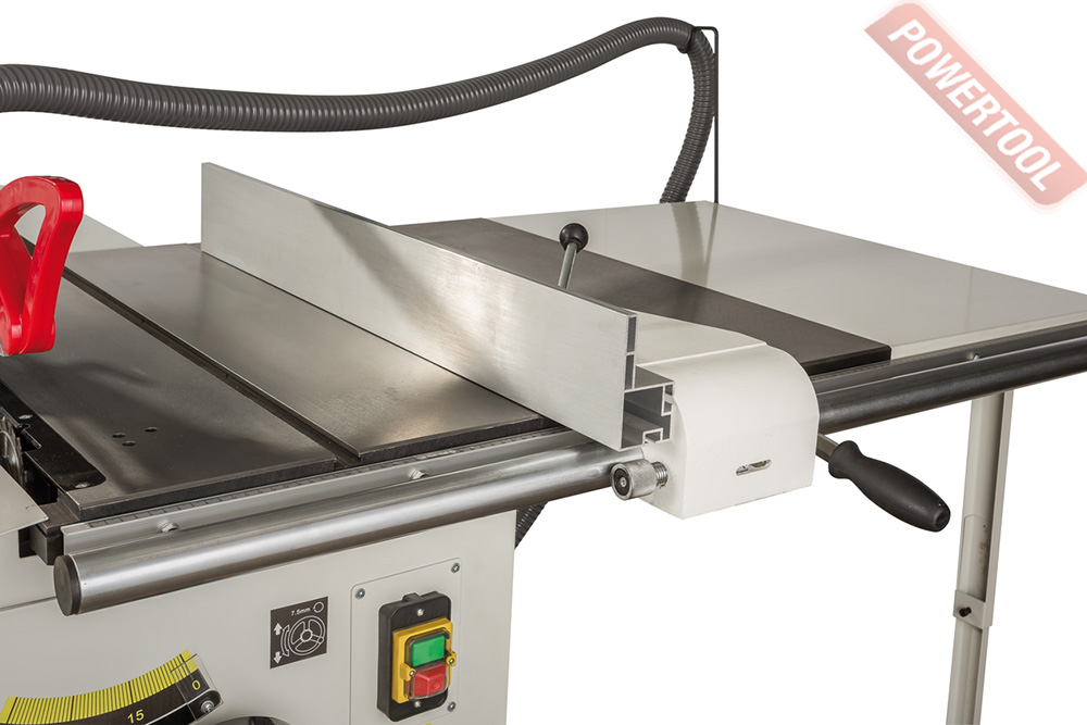 Рабочий стол выполнен из чугунного литья, его можно расширить одной или двумя секциями. Первым ставится чугунный расширитель, к нему можно пристыковывать сегмент из стального листа, оборудованный опорой. Такая база позволяет распиливать детали с отступом 1220 мм от параллельного упора. Сам упор выполнен по классической для профессиональных станков схеме: крепится к массивному чугунному основанию, которое перемещается по цилиндрической направляющей и фиксируется эксцентриковым стопором.