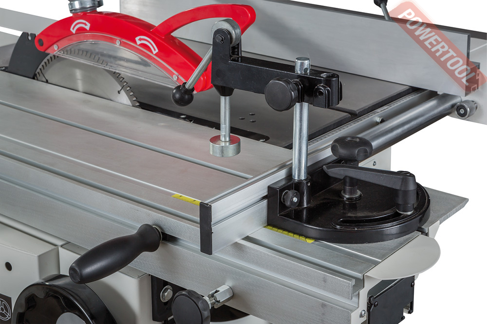 Станок оборудован подвижным столом (кареткой), ход которого составляет 1600 мм. При работе на нем деталь фиксируют при помощи углового упора, эксцентрикового прижима или продольного упора. В стандартный комплект входит и расширение подвижного стола с телескопической опорой и раздвижным поворотным упором заготовки. В разложенном состоянии его длина составляет 2200 мм, в сложенном 1200 мм.
