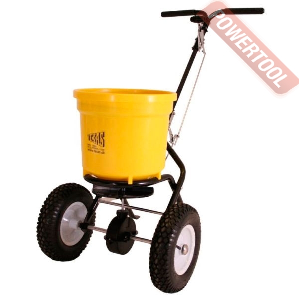 Газонная сеялка и разбрасыватель реагентов TEXAS CS2500 предназначена для применения на средних площадях. Она относится к разбрасывателям веерного типа. т.е. из бункера семена дозированно подаются на диск с тремя отражателями, вращающийся путем механического привода от колес.