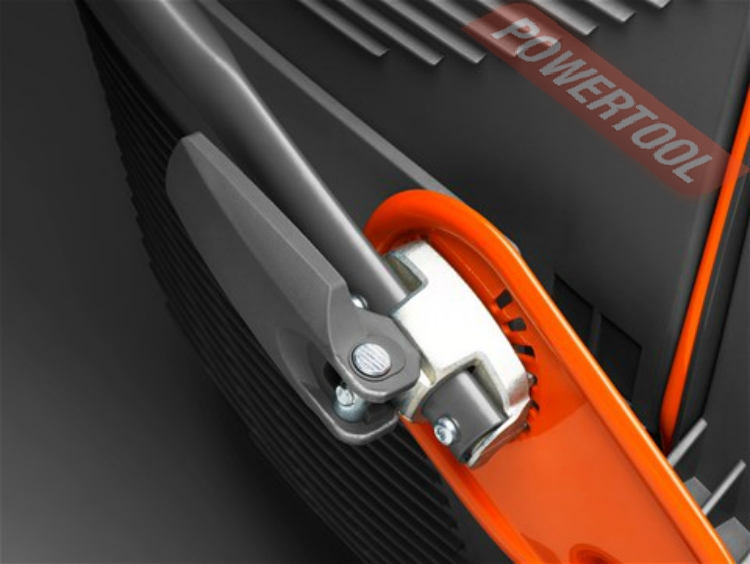 - Быстро складываемая рукоятка. Трубки, образующие рукоятку, соединены шарниром, что позволяет пользователю быстро сложить рукоятку для хранения или транспортировки газонокосилки