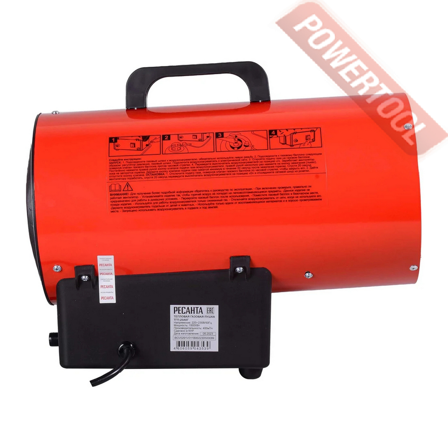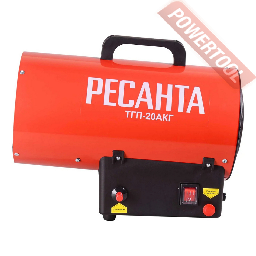 Газовая тепловая пушка РЕСАНТА ТГП-20000 АКГ предназначена для нагрева воздуха в помещениях максимальной площадью 150 м2. В качестве топлива используется сжиженные газы пропан, пропан-бутан, бутан, которые подаются под давлением 0,7 Бар. Контроль пламени происходит с помощью биметаллического термодатчика. При его угасании подача газа прекращается. Розжиг осуществляется с помощью пьезоэлемента. Помимо обогрева газовая тепловая пушка выполняет функцию вентилятора при отключении газового шланга.