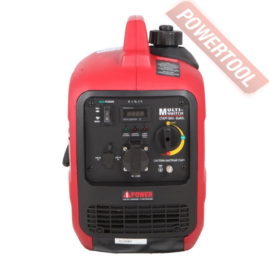Электростанция инверторная однофазная 220 В, мощность максимальная 2 кВт, 4-тактный бензиновый двигатель A-iPower объемом 79 куб.см, топливный бак 4,2 л, расход топлива 1 л/ч, емкость картера 0,38 л, 1 розетка 220В/16A, два выхода USB 5 В, время работы без дозаправки топлива до 4,2 ч, цифровой дисплей, счетчик моточасов, защита от перегрузки, датчик низкого уровня масла, экономичный режим, шумозащитный кожух, размеры 500х290х465 мм, вес 22 кг, свечной ключ, воронка.