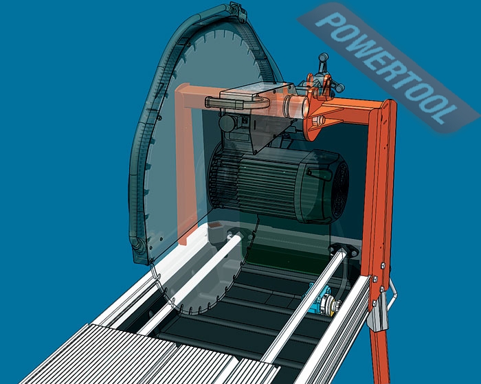 - Оборудуется многофункциональной рабочей поверхностью - кареткой. Этот узел принимает не меньше участия в процессе распиловки камня, нежели режущий механизм. Поверхность выполнена из рифленого из протянутого алюминия для обеспечения максимальной жесткости и легкости. Каретка плавно перемещается по салазкам на станине и имеет опорные ролики на закрытых шарикоподшипниках, что гарантирует длительный срок службы. Перемещение каретка осуществляется при помощи двух удобных рукояток, расположение которых максимально защищает руки оператора от случайного попадания под лезвие диска.