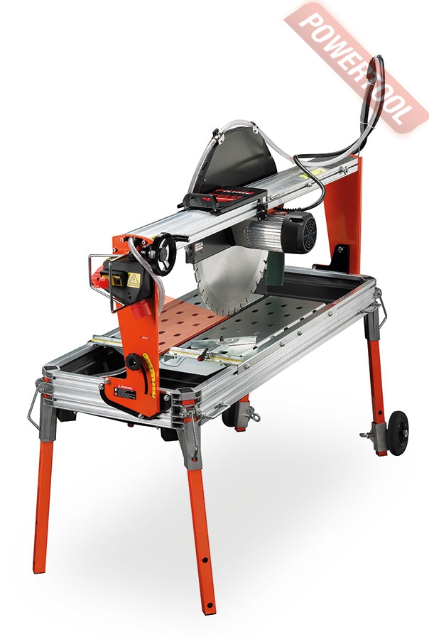 Камнерезный станок BATTIPAV Prime 700S относится к классу мостовых пил по камню, где диск вместе с мотором перемещается по верхней направляющей (мосту) над лежащей на столе заготовкой. Данный агрегат оснащен всем необходимым оборудованием и большим количеством настроек, что позволяет ему выполнять резы и распилы любой сложности, фактически, любых материалов: мраморных и гранитных плит, бетонных плит, керамического кирпича, поротона и каменных блоков. Конструкция станка выполнена из нескольких основных элементов и, несмотря на высокую функциональность, довольно проста. Несущим элементов мостовой пилы является алюминиевая станина, на которую крепится все остальное оборудование, и которая исполняет роль поддона для охлаждающей жидкости и отходов от распиловки камня. Исполнение станины из алюминия позволяет значительно уменьшит вес всего агрегата, но ее специфическая форма с большим количеством ребер жесткости и перфорации гарантирует довольно высокую прочность несущего элемента и позволяет размещать на ней увесистые камни и иные обрабатываемые элементы. По углам станины расположены регулируемые по высоте опоры, которые можно сложить во время транспортировки или использовать как шасси для локальных перемещений.