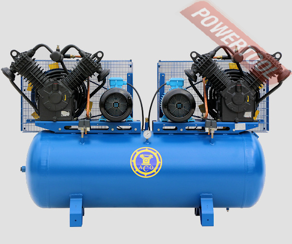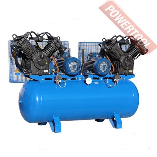 Компрессор масляный с ременным приводом, давление 10 бар, производительность 2200 л/мин, ресивер 500 л, напряжение 400 В, мощность 22 кВт ƒ х 11 кВт), цилиндры / cтупени 4 / 2, регулировка давления, объем масляного картера 2 х 3,2 л, манометр, компрессорная головка 2 х С416М, габариты 2300х700х1500 мм, вес 730 кг.