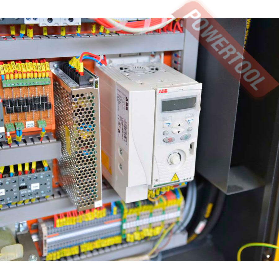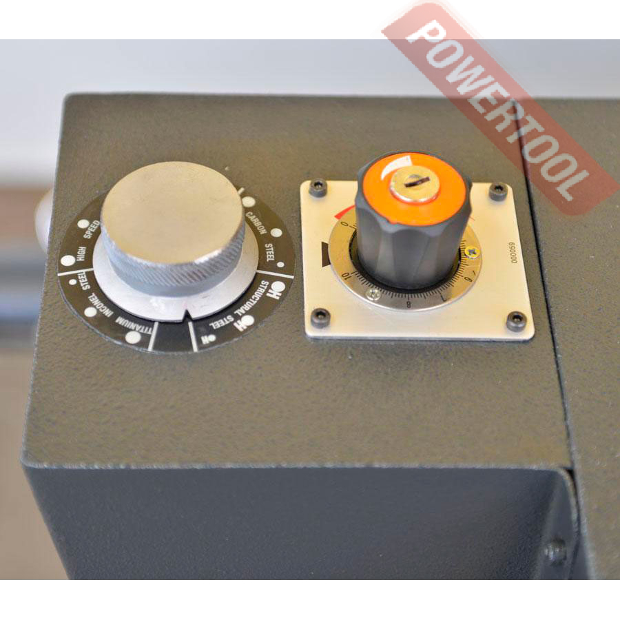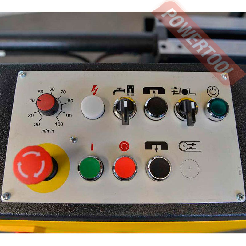 - Бесступенчатая регулировка скорости ленточнопильного полотна в стандартной комплектации. Позволяет точно настроить режимы резки под конкретную заготовку, тем самым увеличив срок службы ленточнопильного полотна.