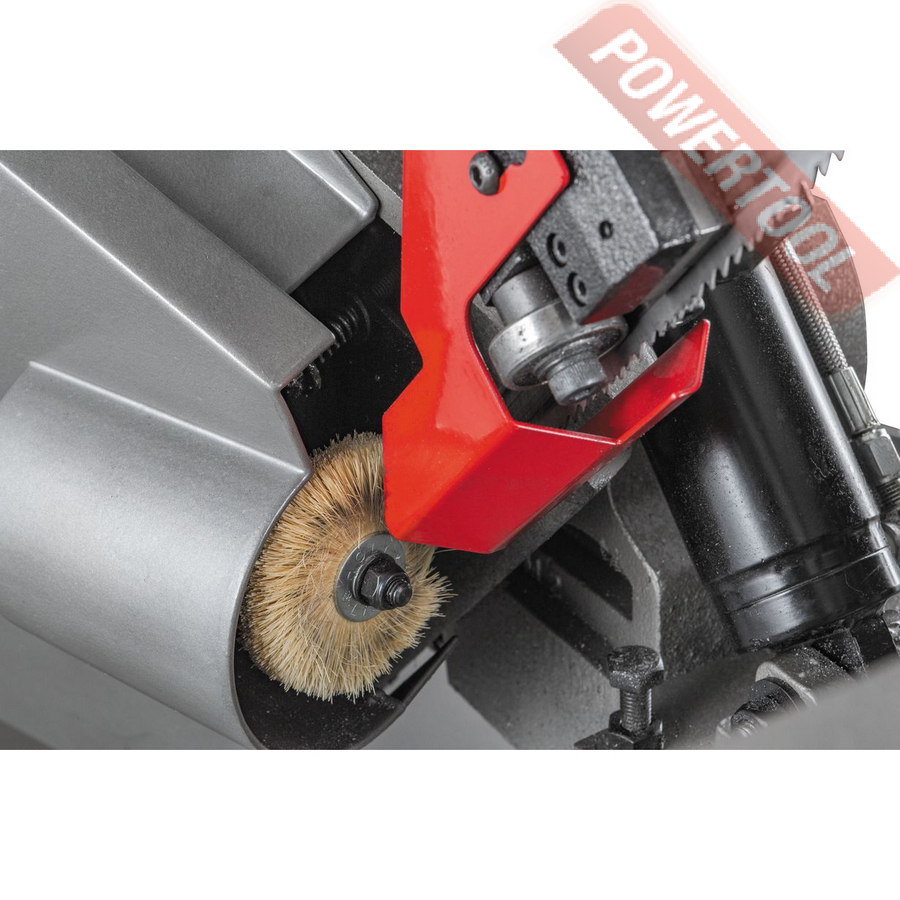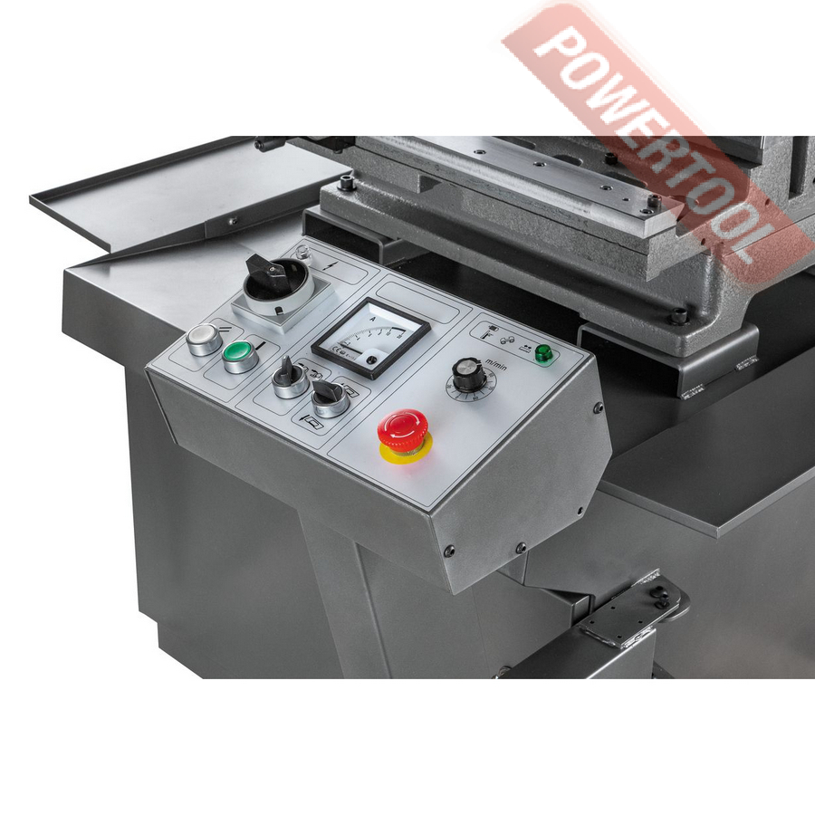 - Встроенный стрелочный амперметр показывает нагрузку при пилении, позволяет оценить правильность выбора режимов резания и контролировать уровень износа ленточного полотна.