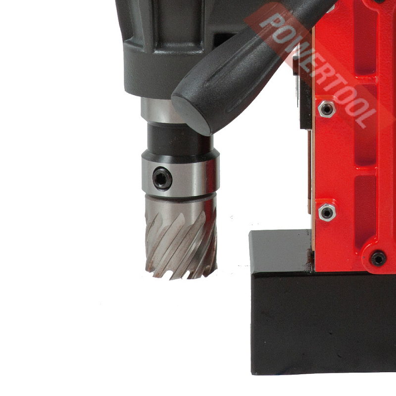 Магнитный сверлильный станок представляет собой электродвигатель с заданной мощностью и числом оборотов. На корпусе имеется ручка плавной регулировки переключения скорости вращения. Шпиндельный узел имеет держатель для сверел WELDON 19. Транспортировочная ручка, расположенная на стойке обеспечивает легкое перемещение сверлильной машины. Станки снабжены предохранителями. Встроенная система охлаждения при работе подает СОЖ в автоматическом режиме. При работе корончатыми сверлами с рабочей длиной 30 мм, для подачи СОЖ необходимо использовать штифт-выталкиватель (арт.320292). Большой рабочий ход станка позволит с легкостью менять корончатые сверла и упростит центрирование отверстия.