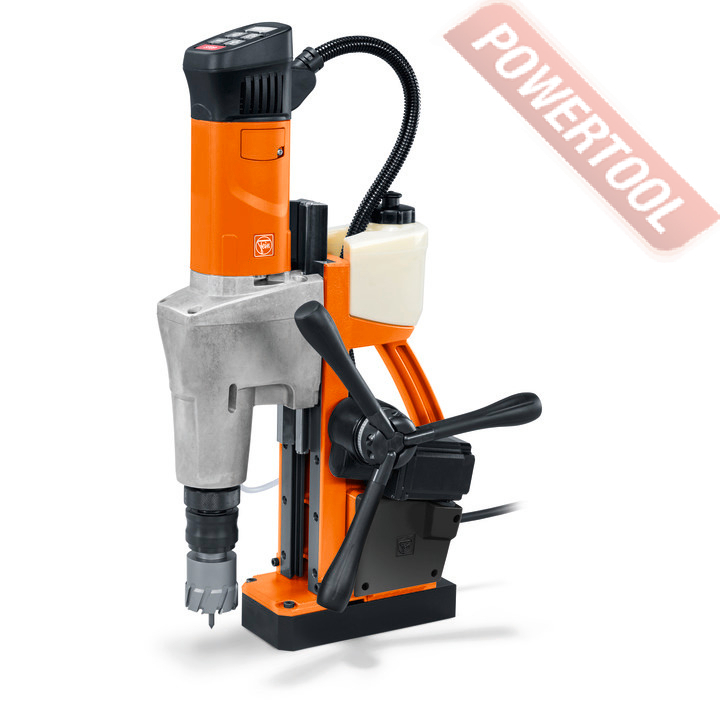 Магнитный сверлильный станок FEIN KBM 50 Auto - полностью автоматический двухскоростной магнитный станок для сверления корончатым сверлом по металлу диаметром до 50 мм и спиральным до 18 мм (до 23 мм в ручном режиме). Хвостовик QuickIN. Нарезание резьбы в ручном режиме до М16. Двойная направляющая для использования больших сверл. Электронная регулировка частоты правого/левого вращения. Величина хода каретки 145 мм (полный диапазон хода 315 мм). Встроенный бачок для СОЖ. Установка рукояти подачи сверла с любой стороны. Станок предназначен для выполнения больших объемов сверления благодаря цифровой регулировке подачи сверла.
