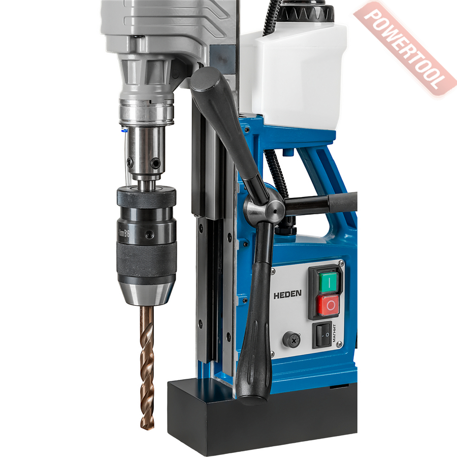 Магнитный сверлильный станок HEDEN DM-50K выполняет сверление горизонтальных, вертикальных и боковых поверхностей корончатыми сверлами диаметром до 50 мм и спиральными сверлами до 16 мм. Направляющие типа двойной ласточкин хвост позволяют перемещать и закреплять привод в любом положении. Благодаря этому можно работать с длинными спиральными сверлами или сверлить ниже уровня основания станка.