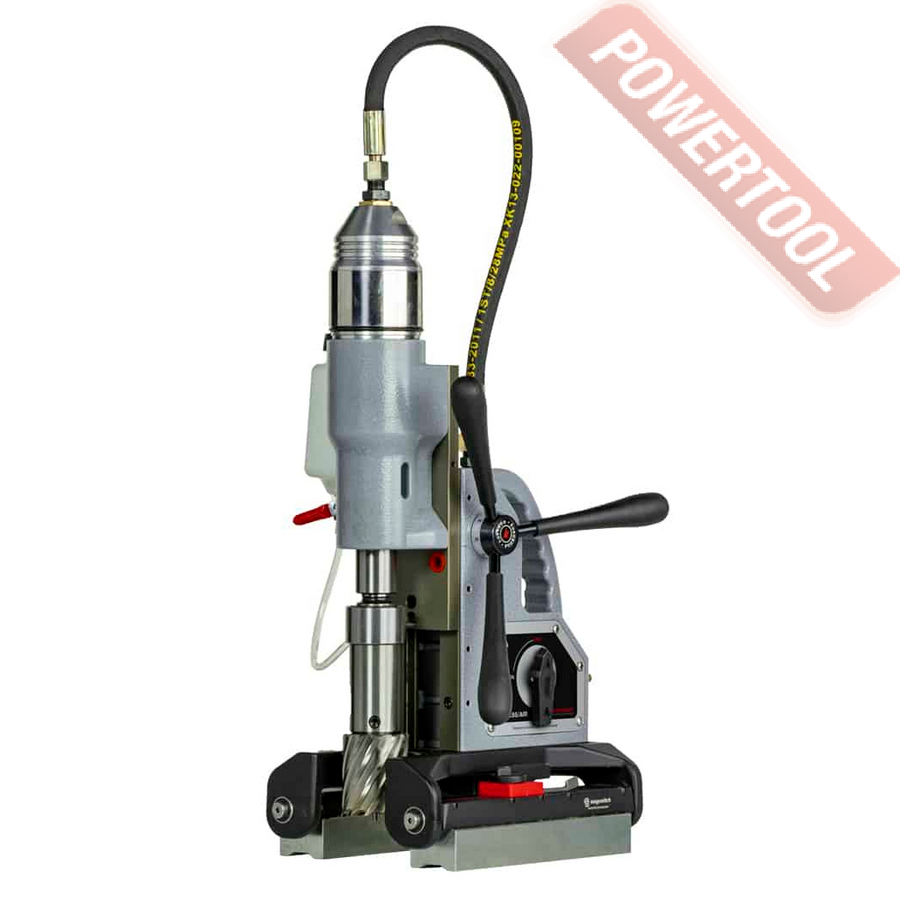 Магнитный сверлильный станок пневматический, подача воздуха 6,3-8 бар, расход воздуха 1,1 куб.м/мин, max диаметр корончатого сверла 55 мм, max диаметр спирального сверла 23 мм, конус шпинделя КМ 3, крепление корончатого сверла на Weldon 19, ход шпинделя 167 мм, частота вращения шпинделя 350 об/мин, 1 скорость, прижимная сила 8826 Н, размер магнитного основания ДхШ 275х190 мм, габариты ДхШхВ 345х245х730 мм, вес 16,7 кг, система подачи СОЖ, возможность фиксации на трубах, в комплекте патрон КМ 3/Weldon 19, система СОЖ, рукоятки 3 шт, набор шестигранных ключей 2.5, 4, 5 мм, гаечный ключ 19/22, страховочная цепь, клин, шланг 14 мм, набор затычек для ушей, защитные очки, перчатки, кейс.