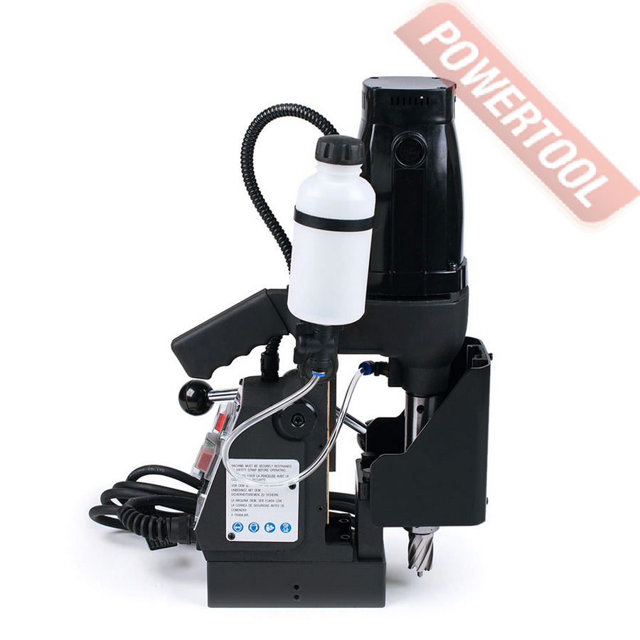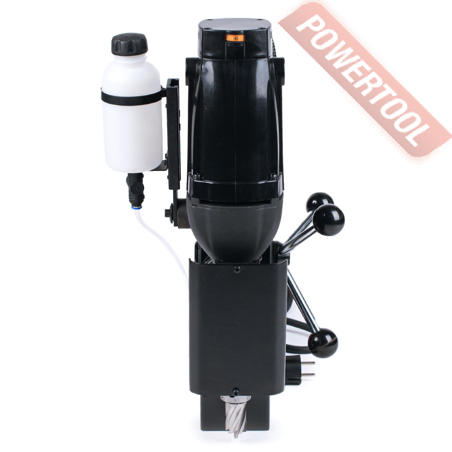Магнитный сверлильный станок, 1100 Вт, 220 В, max диаметр корончатого сверла 40 мм, max диаметр спирального сверла 13 мм, крепление корончатого сверла на Weldon 19, ход шпинделя 85 мм, частота вращения шпинделя 270-610 об/мин, 6 скоростей, прижимная сила 8000 Н, размер магнитного основания ДхШ 165х80 мм, габариты ДхШхВ 265х180х510 мм, вес 14,2 кг, регулировка оборотов, система подачи СОЖ, в комплекте адаптер Weldon 19/B16, трехкулачковый патрон 1-13 мм, система охлаждения, страховочный ремень, рукоятка подачи 3 шт, набор ключей, сменная угольная щетка, кейс.