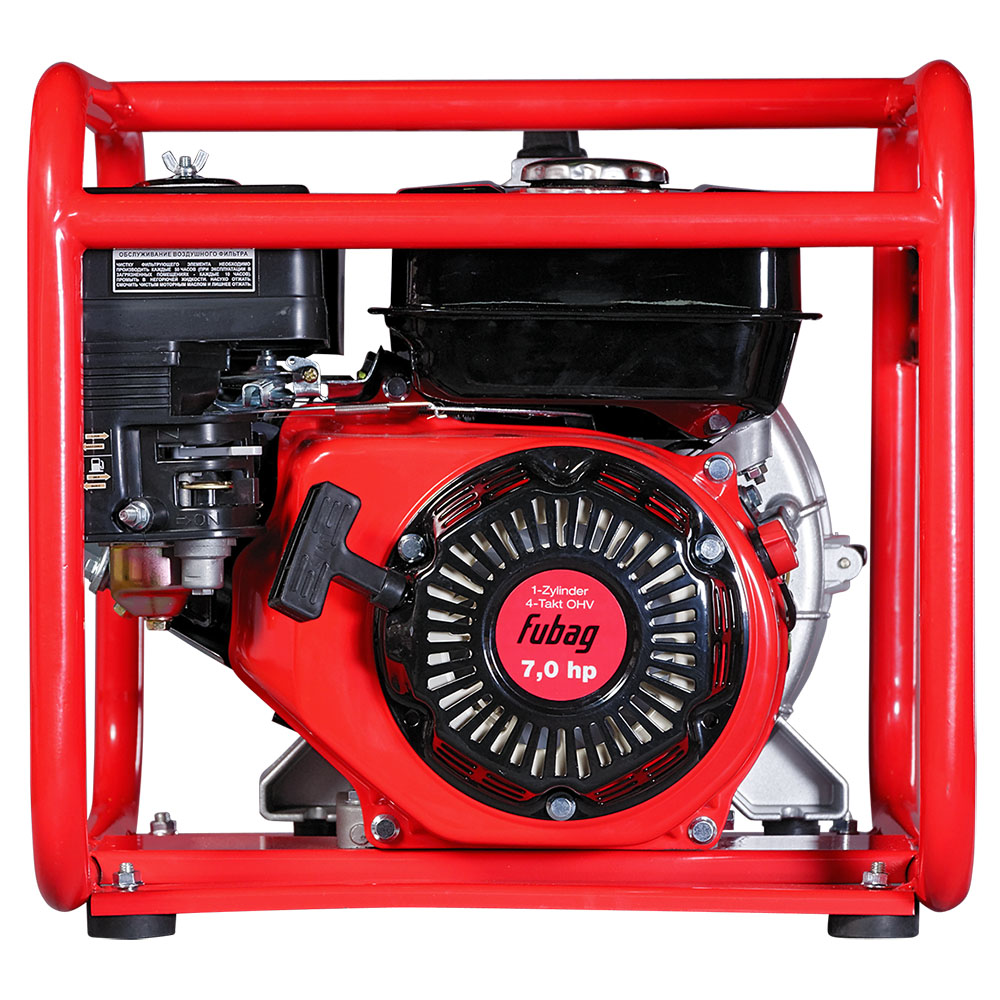 - Профессиональный бензиновый двигатель общего назначения FUBAG мощностью 7 л.с. специально разработан для длительной бесперебойной работы в особо тяжелых условиях. Двигатель является одноцилиндровым 4-х тактным с верхним расположением клапанов (OHV), имеет горизонтальный вал и воздушное охлаждение с системой принудительной циркуляцией. Материалом из которого выполнен двигатель является алюминий, поэтому он имеет выдающееся соотношение мощности к собственному весу. Имеется система защиты, которая выключает или не даёт завести двигатель при низком уровне масла. Небольшой расход топлива и соответствие современным экологическим нормам.