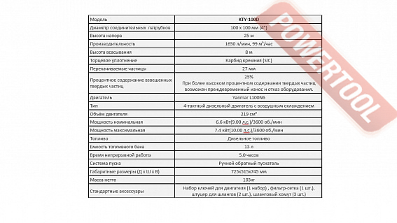 Мотопомпа дизельная для грязной воды KOSHIN KTY-100D представляет собой самовсасывающий водяной насос, приводимый в действие двигателем внутреннего сгорания. Работа данного агрегата происходит следующим образом: мотор приводит в действие диафрагму или рабочее колесо (крыльчатку) насоса. В результате создается разрежение, под действием которого вода поступает во всасывающий шланг и затем выбрасывается во внешнюю напорную трубу. Мотопомпы предназначены для чистой, слабозагрязненной и грязной воды, они используются для осушения водоемов или емкостей, поддержания оросительной системы в рабочем состоянии. Незаменима для наполнения или смены воды в бассейнах и декоративных прудах. В период весеннего половодья при необходимости быстро откачает воду из подвальных помещений или погребов. Также используется как для откачки воды из канав на дачных участках, так и для ликвидации последствий крупных промышленных аварий.
