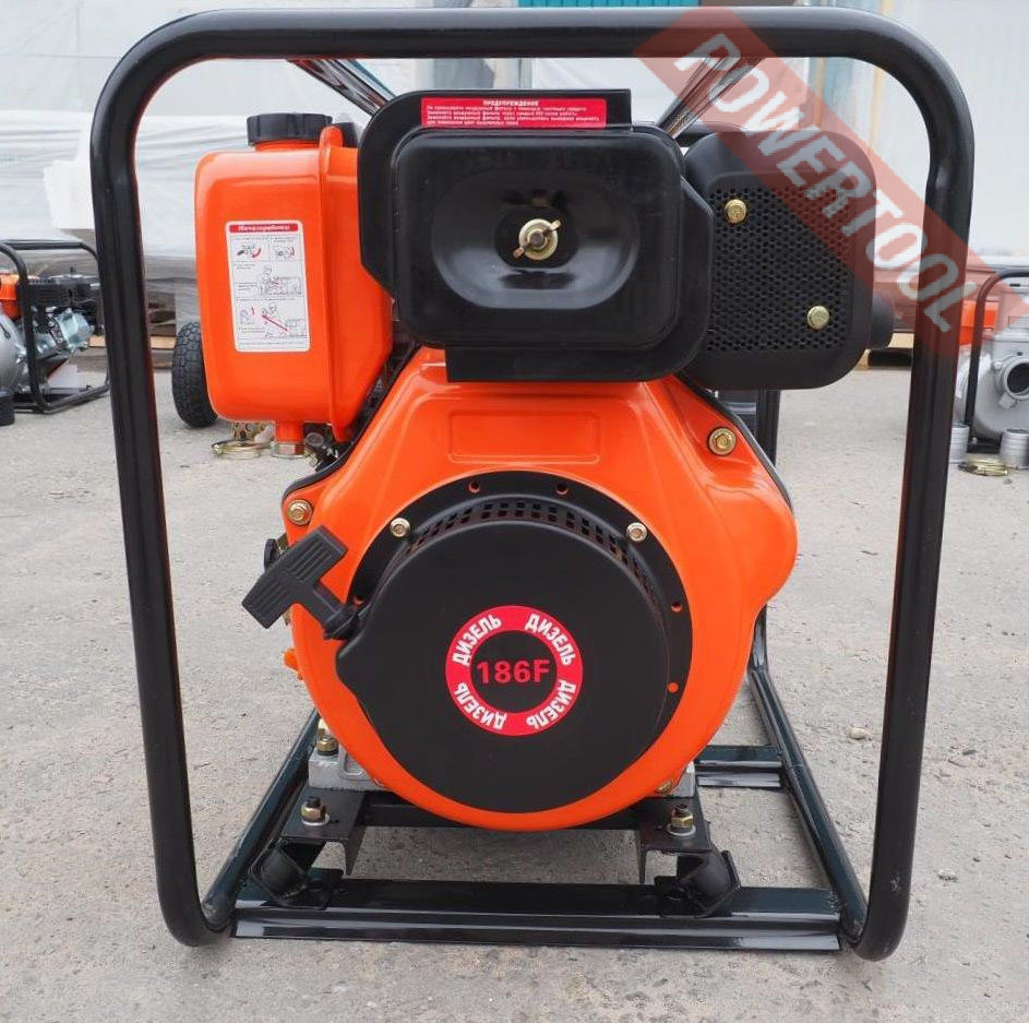 Мотопомпа дизельная для чистой воды, max производительность 1500 л/мин, max уровень подъема 29 м, глубина всасывания до 8 м, диаметр отверстий вход / выход G4 или 100 мм, max допустимый размер частиц 5 мм, дизельный двигатель Lifan 186FA объемом 418 куб.см и мощностью 9,2 л.с., топливный бак 5,5 л, расход топлива 2,2 л/ч, емкость картера 1,65 л, ручной стартер, размер 650х510х630 мм, вес 61 кг, патрубки для шланга, хомуты и всасывающий фильтр.