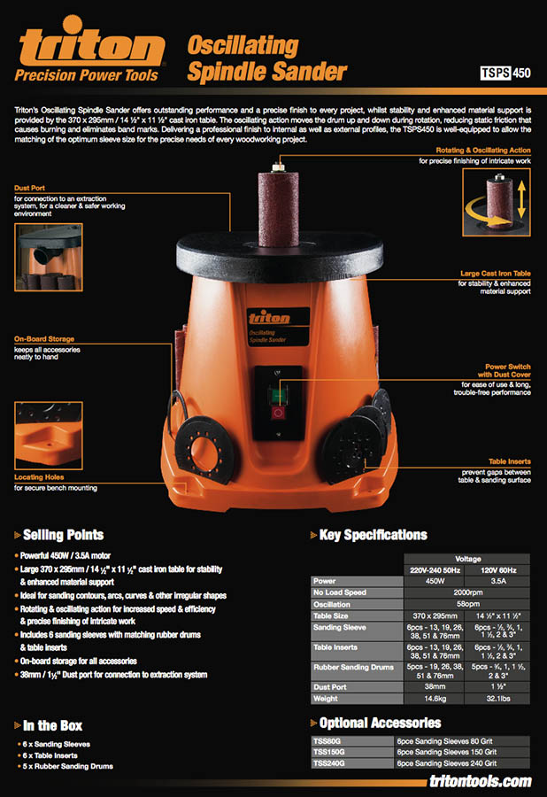 Осцилляционный шпиндельный шлифовальный станок TRITON TSPS450 - компактный станок для шлифования кромок деревянных заготовок, благодаря небольшому весу и скромным габаритам очень удобен при транспортировке и хранении. Рабочим органом является абразивная гильза, которая совершает вращательно-колебательные движения. Ее устанавливают на сменный шпиндель, представляющий из себя резиновую втулку. Оснастку выбирают в соответствии с необходимой зернистостью и минимальным радиусом закругления, обрабатываемой детали. Доступные диаметры гильз 13-76 мм, в штатный комплект поставки входит их полный набор с зернистостью 80G, в качестве принадлежности доступны и другие марки абразива: от 60 до 150G - то есть для всех возможных случаев. Станок идеален для любительской работы с деревом, поскольку позволяет получить профессиональное качество обработки кромок с высокой производительностью и экономичным расходованием ресурса абразива, занимает мало места, удобен для перевозки.