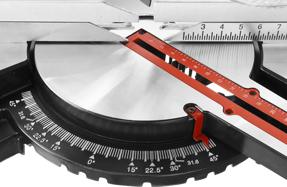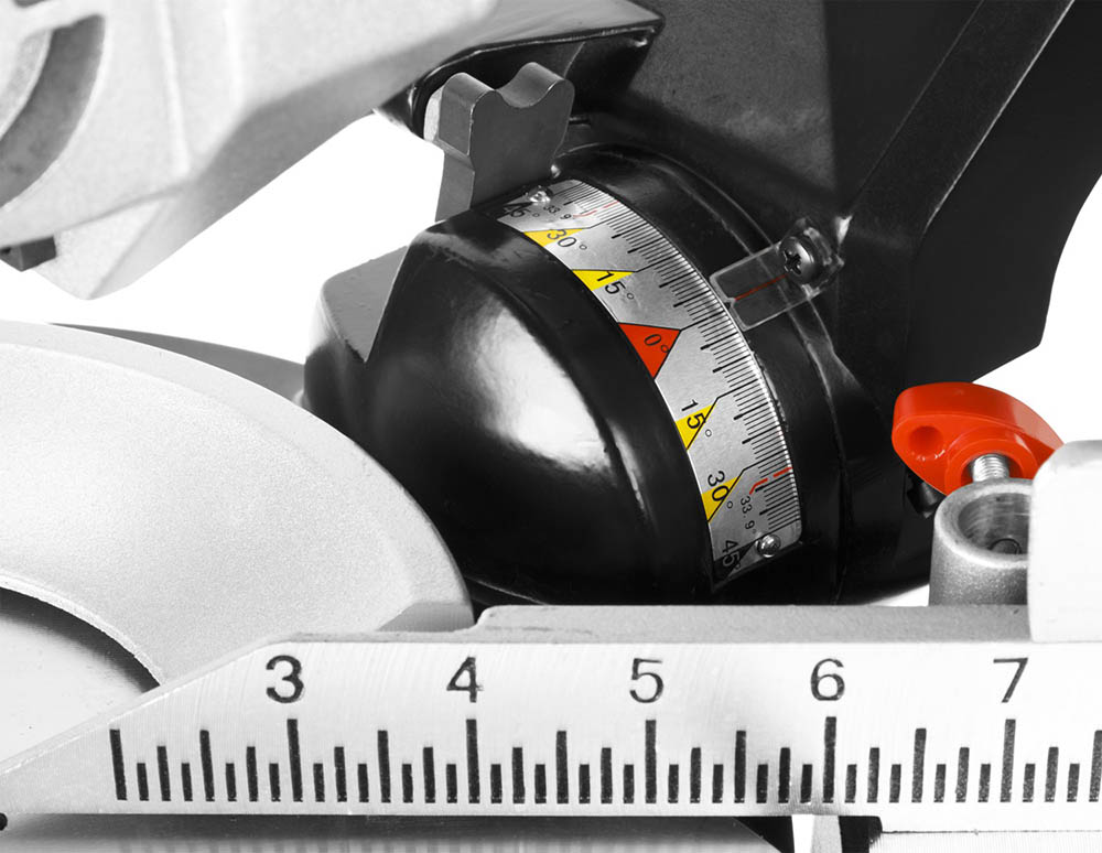 - Наклон пильного диска. Головка пилы наклоняется влево, с дополнительным угловым диапазоном для подреза.