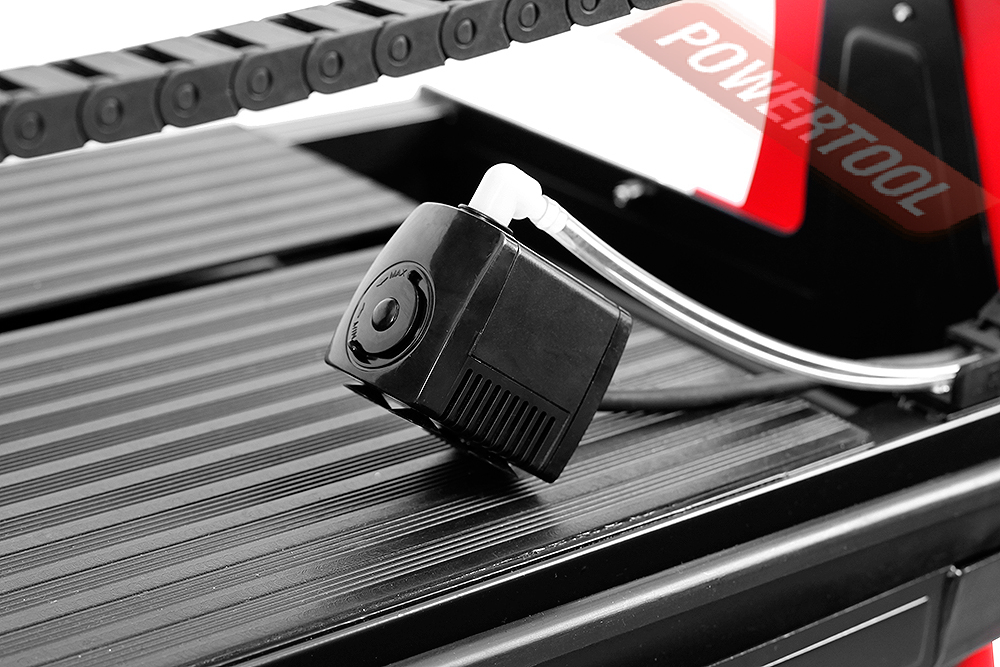 - Водяное охлаждение. Плиткорез оборудован циркулирующей системой подачи воды в зону резания для охлаждения алмазного круга. Циркулирующая система подачи жидкости позволяет охладить круг в процессе эксплуатации и предотвратить быстрое стирание алмазной оснастки. При работе плиткорезного станка вода используется не только для охлаждения диска, но и для вымывания шлама, что помогает увеличить ресурс алмазного диска на 20-30 процентов.