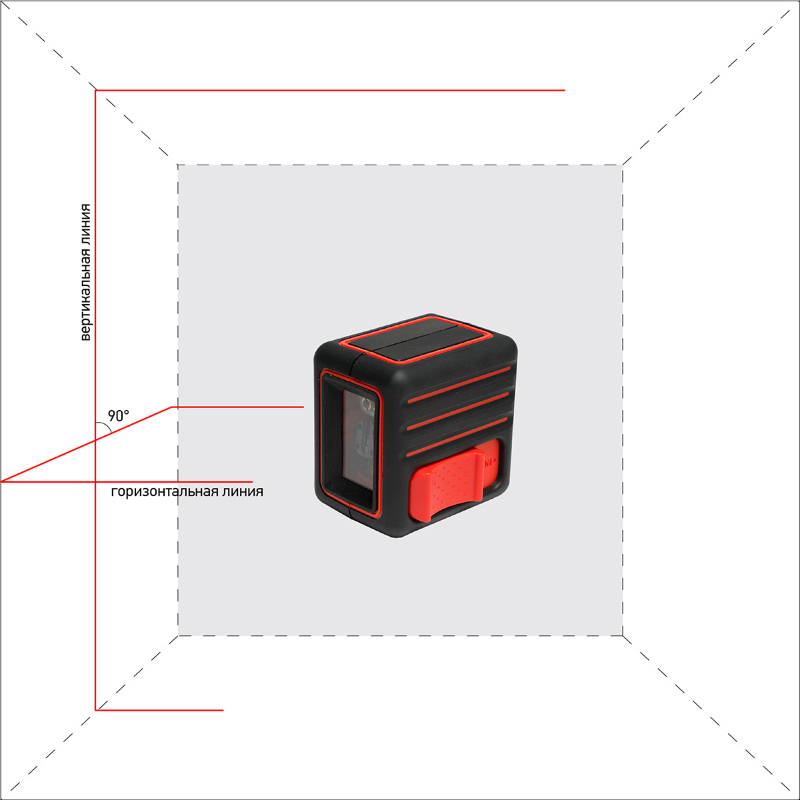 - Пересекающиеся плоскости под 90 град. С помощью линий пересекающихся под прямым углом (угол между лазерными плоскостями 90 град.) можно быстро выполнять разметку для ровной установки материалов или конструкций. ADA CNBE MINI относится к непрофессиональным (для дома) приборам. Яркость луча пригодна для работы только в небольших помещениях. Укладка плитки, крепление полок и навесных модулей мебели, строительство небольших перегородок и т.д.