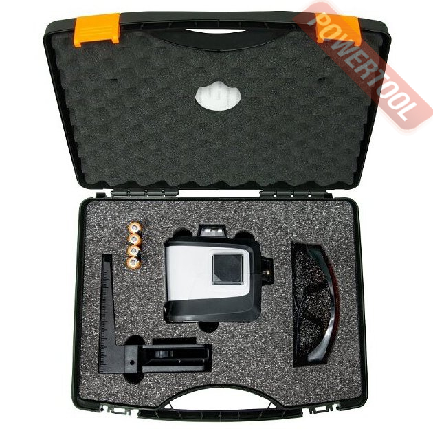 - Питание прибора осуществляется при помощи четырех стандартных батарей типа АА на 1,5 В. Время работы с одним лазерным лучом: 25 часов, с 2 лучами 6 часов, с 3 лучами: 6 часов.