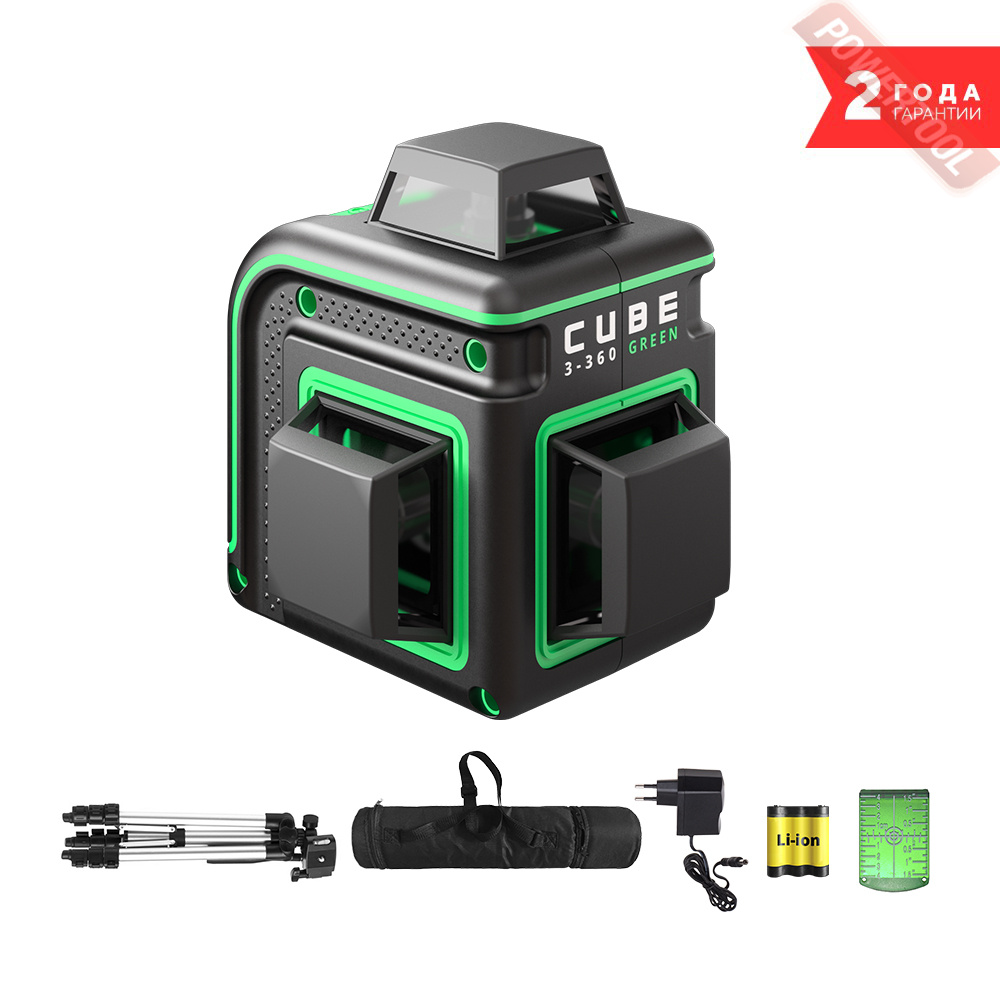 Лазерный уровень, прибор проецирует 1 горизонтальную линию угол развертки 120 градусов, 4 вертикальные линии угол развертки 270 градусов, которые образуют 2 вертикальные плоскости, перпендикулярные друг другу, точку отвеса, точность 0,3 мм/м, диапазон работы 20/50 м, точность самовыравнивания 3,5 градуса, сервопривод, резьба штатива 5/8 дюйма, красный лазер, мишень, адаптер, очки, аккумуляторы и ЗУ, кейс.