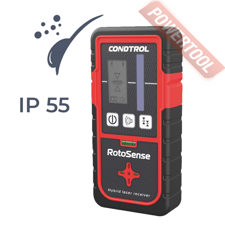 Режим можно выбирать в зависимости от поставленных задач. Приемник лазерного излучения RotoSense также подходит для работы на открытом воздухе и на открытых строительных площадках. Высокое качество и защита от пыли и воды (IP55), а также высокопрочные материалы, используемые при изготовлении устройств, обеспечивают надежную работу ресивера. Корпус RotoSense надежно защищен от влаги, пыли, грязи и мелких частиц. RotoSense оснащен цифровым спиртовым уровнем. Это позволяет выравнивать приемник. В верхней части приемника находятся мощные магниты, благодаря которым устройство можно крепить к потолочному профилю и вертикальным конструкциям. Детектор лазерного излучения RotoSense экономит время разметки, повышает эффективность решения следующих задач: оценка перепада высот, опалубка фундамента, рытье траншеи и др.