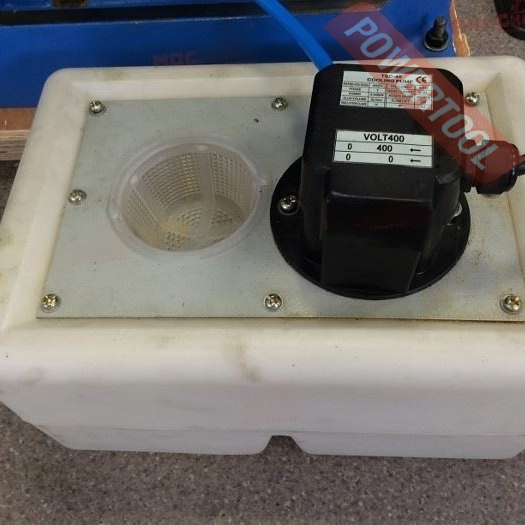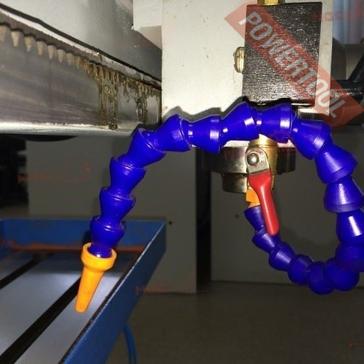 - Система подачи СОЖ имеет замкнутый тип. Из бака емкостью 10 литров с помощью помпы мощностью 45 Вт охлаждающая жидкость подается на форсунку в виде модульной трубки и на заготовку. Далее СОЖ попадает на координатный стол на котором есть специальный бортик сбора жидкости. В углу станка установлен штуцер, через который СОЖ опять оказывается в баке.