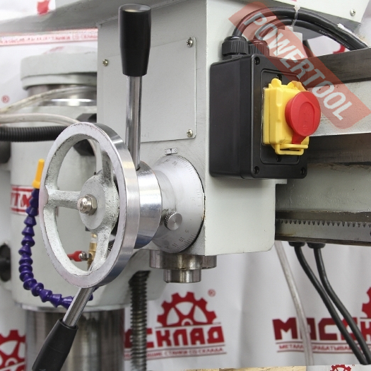 - Компоновка радиально-сверлильного станка позволяет установить шпиндель с инструментом в любой точке рабочей зоны за счет перемещения шпиндельной головки (бабки) по направляющим траверсы (рукава) и поворота траверсы вокруг колонны.