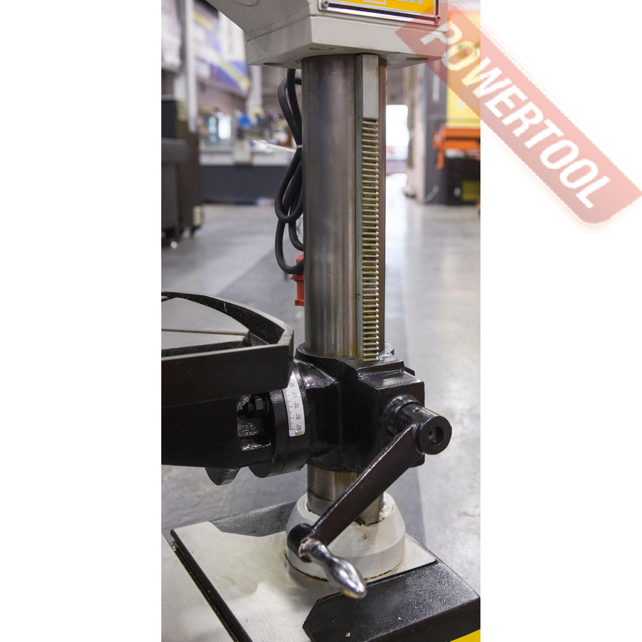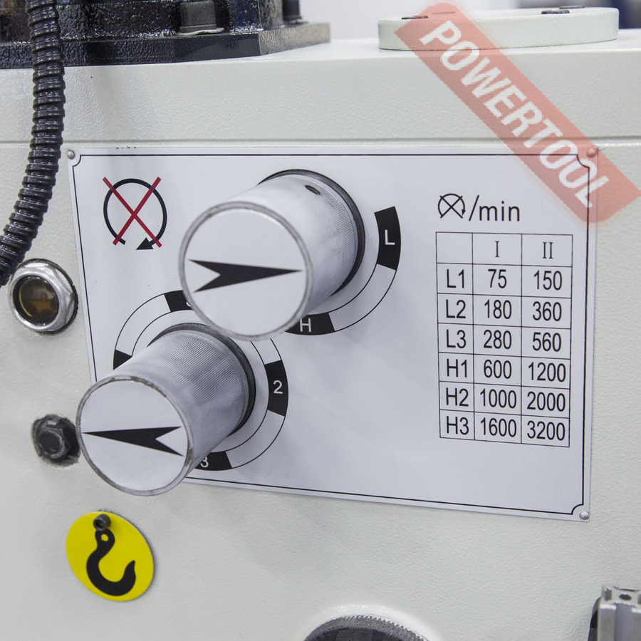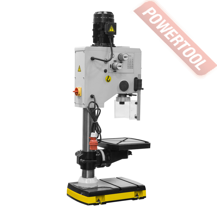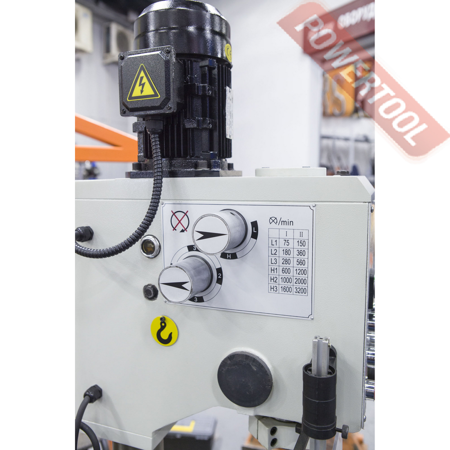 Редукторный сверлильный станок, 850 Вт, 380 В, max диаметр сверления 25 мм, max нарезаемая резьба M12, частота вращения шпинделя 75-3200 об/мин, 12 скоростей, бесступенчатая регулировка оборотов, конус шпинделя КМ-3, посадочное сверлильного патрона B16, диапазон хвостовиков для патрона 3-16 мм, ход пиноли шпинделя 130 мм, вылет шпинделя 250 мм, шпиндель-стол 350 мм, шпиндель-основание 620 мм, диаметр стойки 100 мм, размер основания 530х325 мм, размер стола 375х375 мм, наклон стола влево/вправо 45/45 градусов, размер Т-образного паза 14 мм, подсветка рабочей зоны, габариты ДхШхВ 600х450х1450 мм, вес 180 кг, в комплекте патрон ключевой В16 3-16 мм, оправка КМ-3/B16, втулка переходная КМ-3/КМ-2, защитный экран, LED лампа освещения.