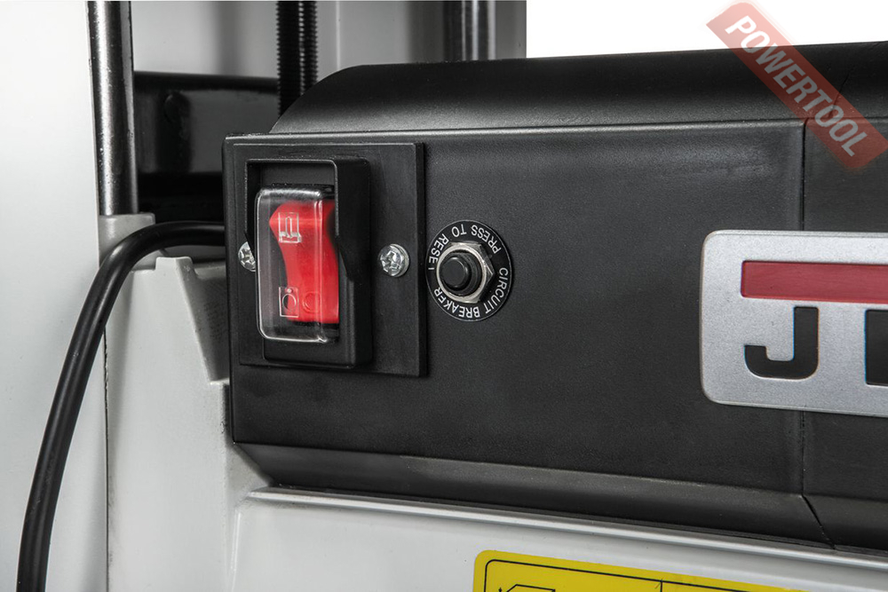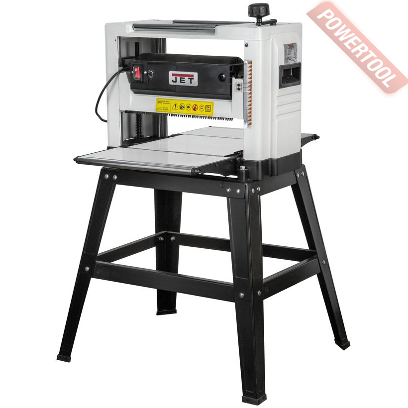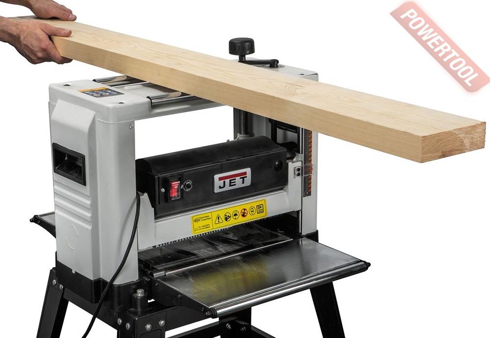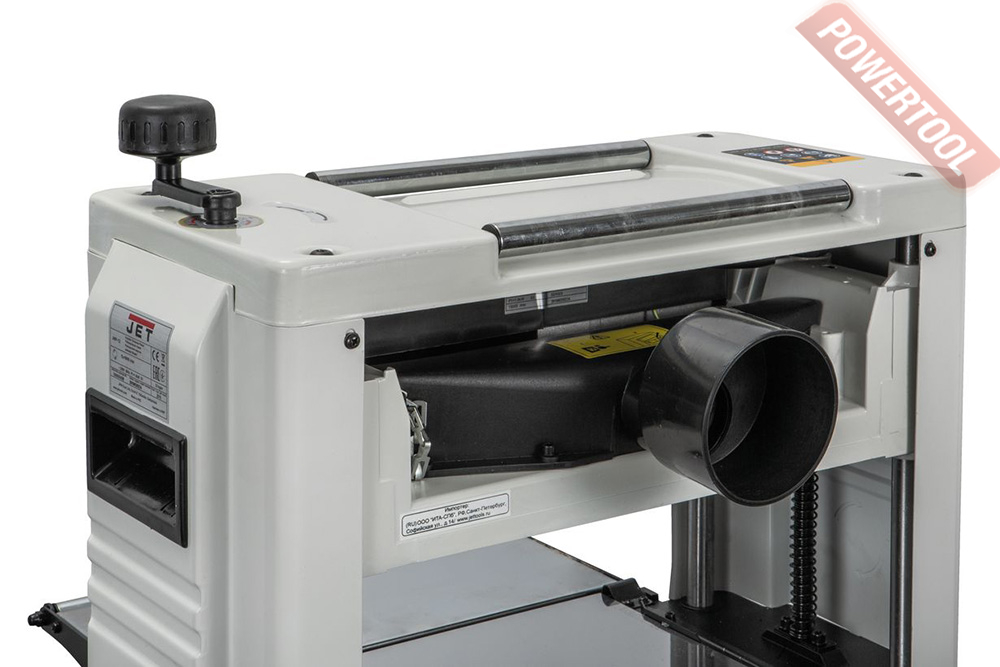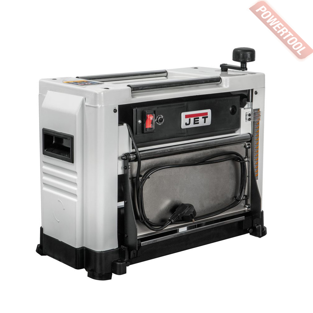 Рейсмусовый станок JET JWP-12 - переносной рейсмусовый станок с откидными столами. Несмотря на компактные размеры, оборудован мощным (1800 Вт) тяговитым коллекторным двигателем и позволяет «пропускать» заготовки шириной до 12 дюймов (примерно 300 мм) с высокой производительностью. При тщательной настройке обеспечивает высокое качество рейсмусования, после которого не требуется дополнительная финишная обработка деталей. Подходит для грубого чернового строгания, причем лучше многих других однотипных моделей, поскольку в отличие от них имеет прочные перетачиваемые ножи, зафиксированные в барабане распорными планками, а не узкие одноразовые. Дополнительным преимуществом является запасная пара качественных лезвий из быстрорежущей стали, поставляемая в штатном комплекте. Станок имеет пылесборный кожух с патрубком для подключения к системе аспирации и оборудован типовыми для переносных рейсмусов системами регулировки высоты строгания вращающейся рукояткой и автоматической протяжки заготовки при помощи обрезиненных валов.
