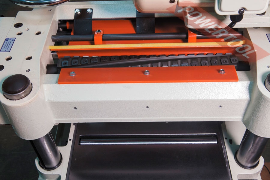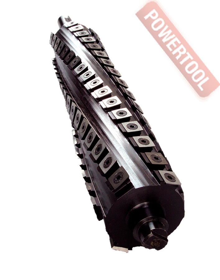 Станок укомплектован ножевым валом Helical. Это сегментированный строгальный вал для чистовой обработки древесины на котором установлено множество твердосплавных лезвий. В зависимости от типа станка используются четырехсторонние лезвия 15,0x15,0x2,5 мм R150(радиус закругления кромки) или двухсторонние 30,0x12,0x1,5 мм. Затупившиеся лезвия сначала переворачивают и лишь потом заменяют, причем не все сразу, а выборочно по мере износа. По многочисленным отзывам пользователей ресурс очень велик и фактически мало зависит от твердости обрабатываемой древесины и ее чистоты (наличия земли или инородных включений). Никаких настроек после замены не требуются. Ножевой вал helical обеспечивает значительно более высокое качество строгания, поэтому считается необходимым атрибутом станка, используемого интенсивно. Лезвия расположены спирально и входят в заготовку последовательно, что снижает ударные нагрузки, шум и вибрацию реже образуются «вырывы» древесины на проблемных участках, меньше вероятность скалывания сучков, нет «волны» характерной для обычных станков. Стружка отходит мелкая, благодаря чему улучшается работа системы аспирации. Профессионалы, опробовавшие в работе станки с технологией helical как правило уже не возвращаются к моделям с обычными прямыми лезвиями, что является лучшей рекомендацией! Применение технологии Helical необходимо при больших объемах работ, поскольку обеспечивает высокие эксплуатационные характеристики строгального оборудования. Во-первых, это очень простое обслуживание: ножи почти не затупляются и обычно требуют переворота или замены лишь в случае поломки об инородные включения высокой твёрдости. И то заменяются не все сегменты, а лишь поврежденные. Во-вторых, спиральное расположение лезвий обеспечивает их вход в древесину под углом и последовательно, что дает более чистый срез (особенно на сучках) при меньших шумах и вибрациях.
