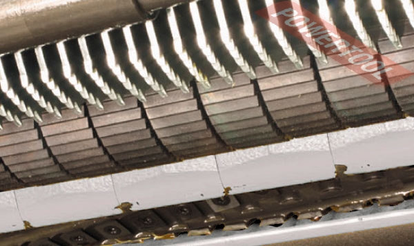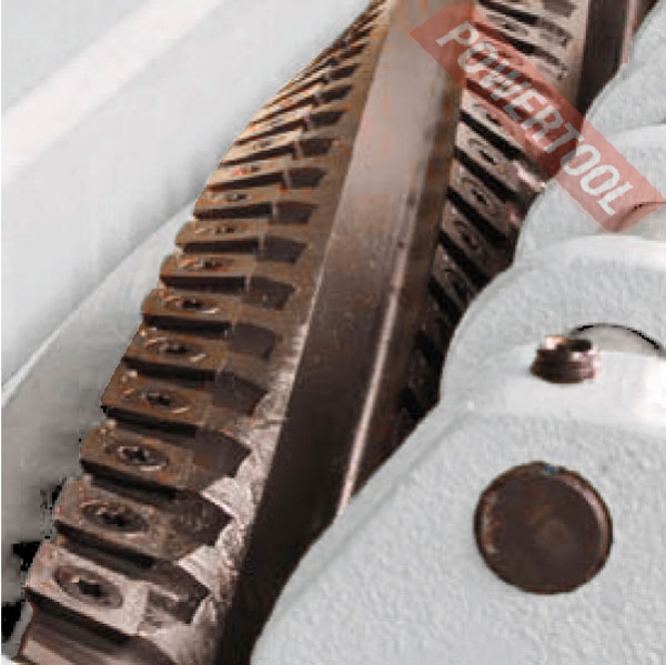 Станок укомплектован ножевым валом Helical. Это сегментированный строгальный вал для чистовой обработки древесины на котором установлено множество твердосплавных лезвий. В зависимости от типа станка используются четырехсторонние лезвия 15,0x15,0x2,5 мм R150(радиус закругления кромки) или двухсторонние 30,0x12,0x1,5 мм. Затупившиеся лезвия сначала переворачивают и лишь потом заменяют, причем не все сразу, а выборочно по мере износа. По многочисленным отзывам пользователей ресурс очень велик и фактически мало зависит от твердости обрабатываемой древесины и ее чистоты (наличия земли или инородных включений). Никаких настроек после замены не требуются. Ножевой вал helical обеспечивает значительно более высокое качество строгания, поэтому считается необходимым атрибутом станка, используемого интенсивно. Лезвия расположены спирально и входят в заготовку последовательно, что снижает ударные нагрузки, шум и вибрацию реже образуются «вырывы» древесины на проблемных участках, меньше вероятность скалывания сучков, нет «волны» характерной для обычных станков. Стружка отходит мелкая, благодаря чему улучшается работа системы аспирации. Профессионалы, опробовавшие в работе станки с технологией helical как правило уже не возвращаются к моделям с обычными прямыми лезвиями, что является лучшей рекомендацией! Применение технологии Helical необходимо при больших объемах работ, поскольку обеспечивает высокие эксплуатационные характеристики строгального оборудования. Во-первых, это очень простое обслуживание: ножи почти не затупляются и обычно требуют переворота или замены лишь в случае поломки об инородные включения высокой твёрдости. И то заменяются не все сегменты, а лишь поврежденные. Во-вторых, спиральное расположение лезвий обеспечивает их вход в древесину под углом и последовательно, что дает более чистый срез (особенно на сучках) при меньших шумах и вибрациях.