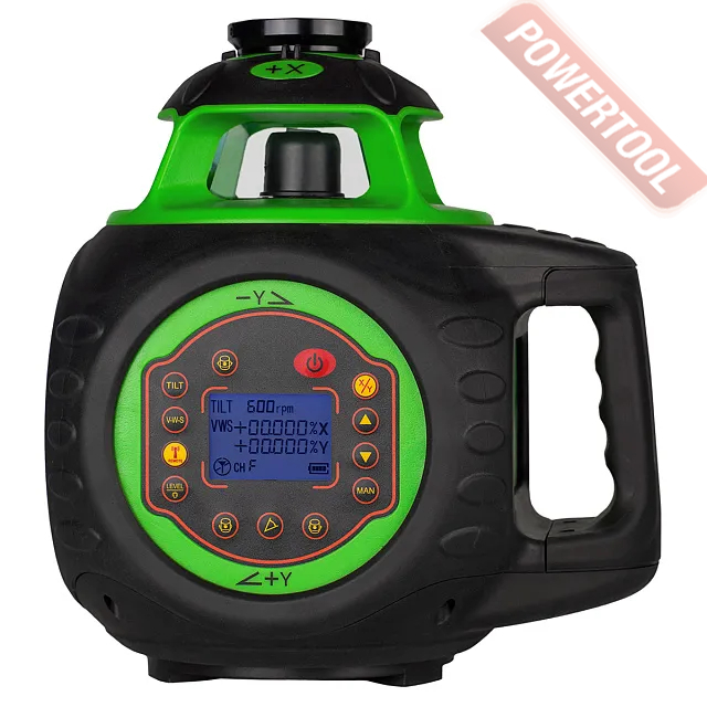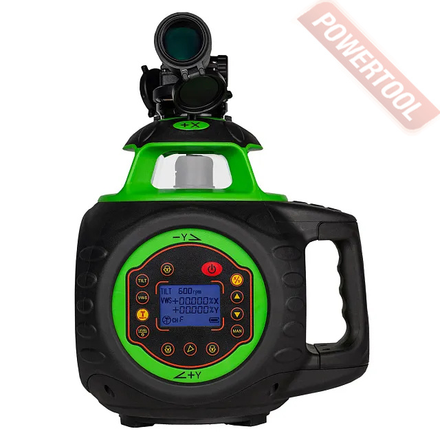 Оснащен стандартными функциями сканирования в секторе и регулировки скорости вращения роторной головки. Помимо этого доступна регулировка угла наклона по двум осям с выводом текущего значения на дисплей. Технология особенно актуальна при прокладке инженерных сетей, возведения откосов в котловане и т.д. Ручная установка выполняется с помощью кнопок в диапазоне 10 процентов.