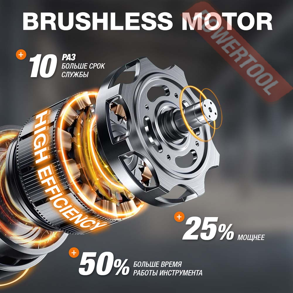• Бесщеточный электродвигатель. Бесщеточный двигатель обеспечивает высокую мощность при меньшем потреблении энергии, что позволять работать до 30 процентов времени дольше на одном заряде аккумулятора.