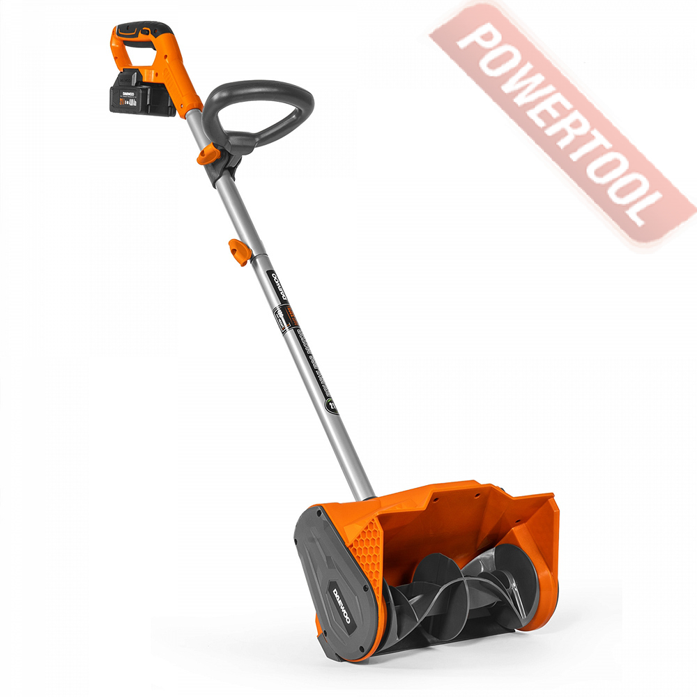 Снегоуборщик аккумуляторный, ширина ковша 33 см, высота ковша 12 см, бесщеточный двигатель, 2300 об/мин, аккумулятор Li-ion 21 В, регулировка направления выброса снега, дальность выброса снега до 7 м, пласткиковый шнек, складная конструкция, регулируемая дополнительная рукоятка, ременный привод, габариты упаковки 545х245х220 мм, вес 5 кг, аккумулятор 4 Ач и ЗУ.