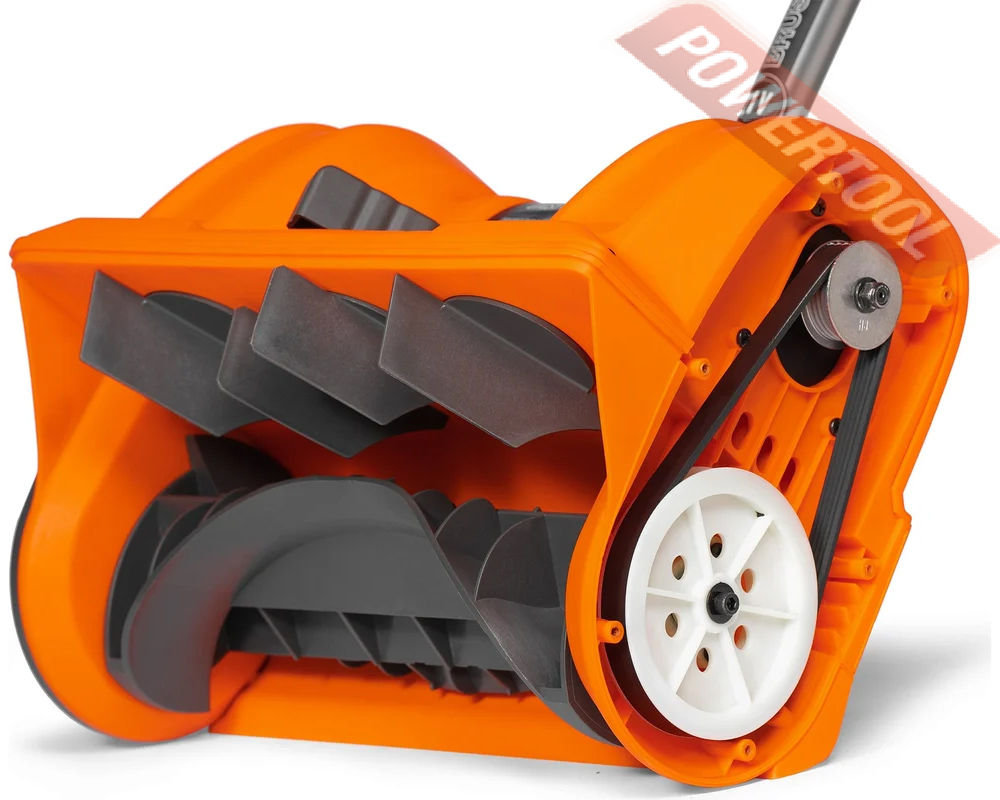 • Ременный привод обеспечивает надежную передачу крутящего момента от двигателя к шнеку, одновременно защищая мотор от перегрузок и повреждений в случае застревания или блокировки шнекового механизма.