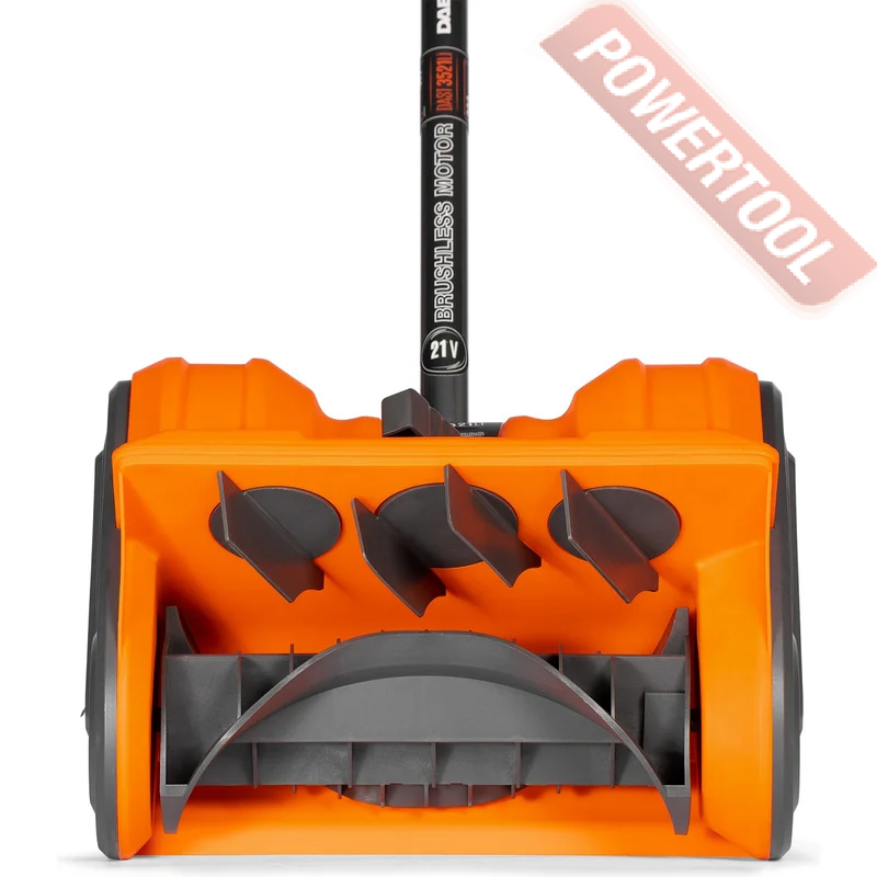 Снегоуборщик аккумуляторный, ширина ковша 30 см, высота ковша 11 см, бесщеточный двигатель, 2200 об/мин, аккумулятор Li-ion 21 В, регулировка направления выброса снега, дальность выброса снега до 4 м, пласткиковый шнек, складная конструкция, регулируемая дополнительная рукоятка, ременный привод, габариты упаковки 760х380х285 мм, вес 3,58 кг, поставляется без АКБ и ЗУ.