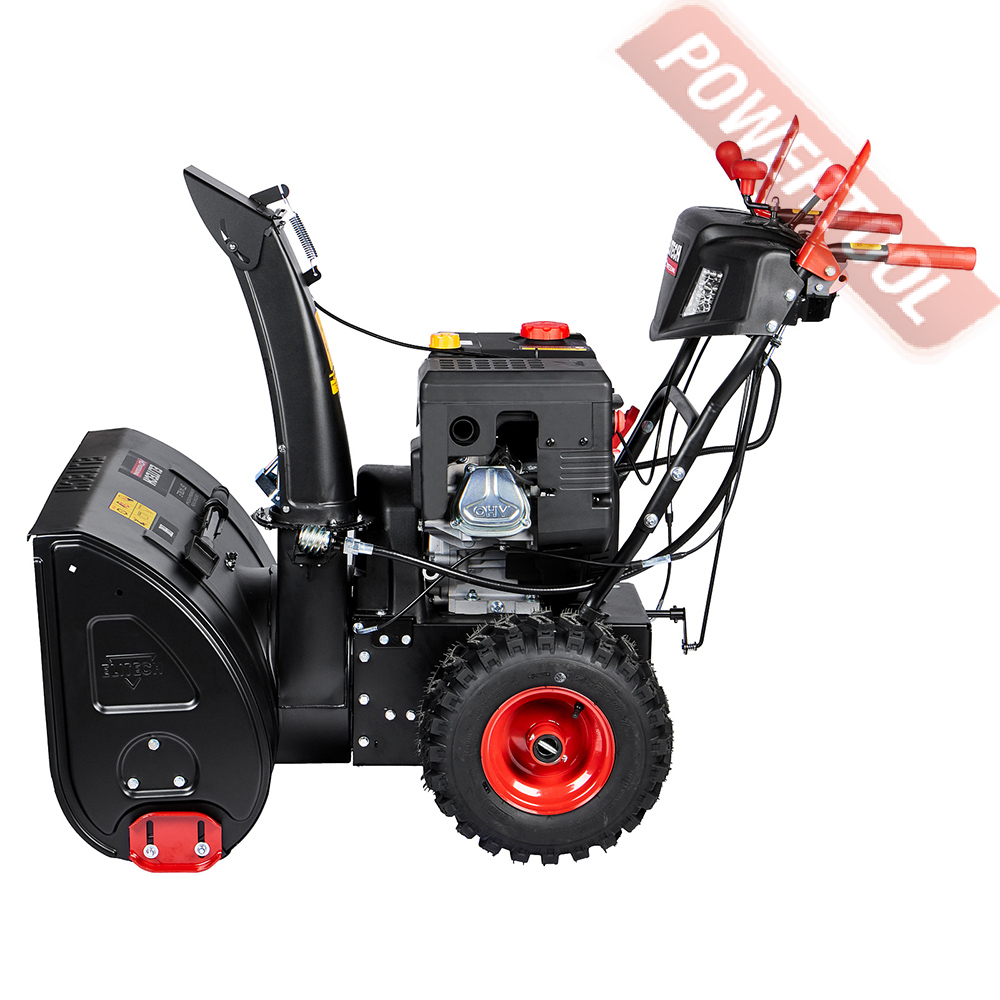 Снегоуборщик колесный самоходный, ширина ковша 76 см, высота ковша 54,5 см, скорости 6 вперед и 2 назад, выбор направления и дальности выброса снега рукоятками с панели оператора, угол поворота желоба 190 градусов, дальность выброса достигает до 15 м, подогрев рукояток, LED-фара, пневматические колеса 38 см, 4-тактный бензиновый двигатель Loncin LC190FDS объемом 420 куб.см мощностью 14 л.с., электростартер от сети 220 В, топливный бак 5,5 л, расход топлива 1,2 л/ч, емкость картера 1,1 л, трансмиссия фрикционный диск, габариты 1180х820х780 мм, вес 124 кг.